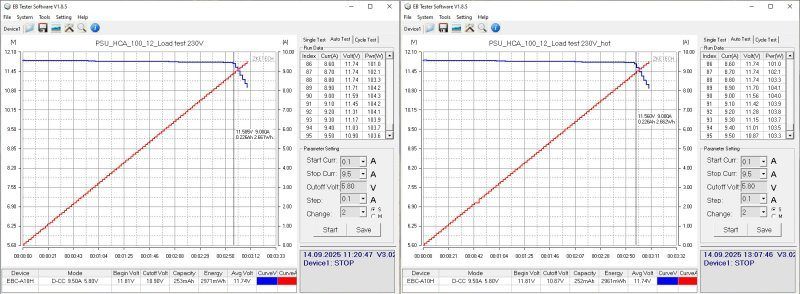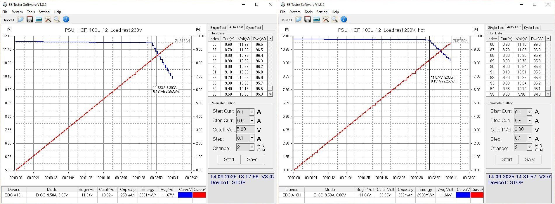 Но что интересно, у этого экземпляра ток защиты 8.3 ампера против 9 у предыдущего, как-то слишком большая разница чтобы списать ее на погрешность, потому как шунты у этих блоков одинаковые. Кстати, фактически для 100 ватт 12 вольт блока питания 8.3 ампера и есть заявленный максимум.