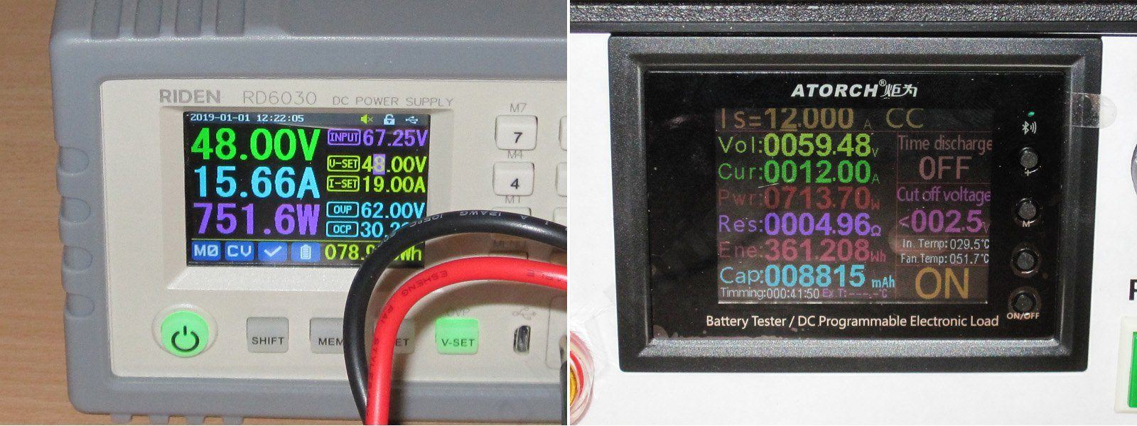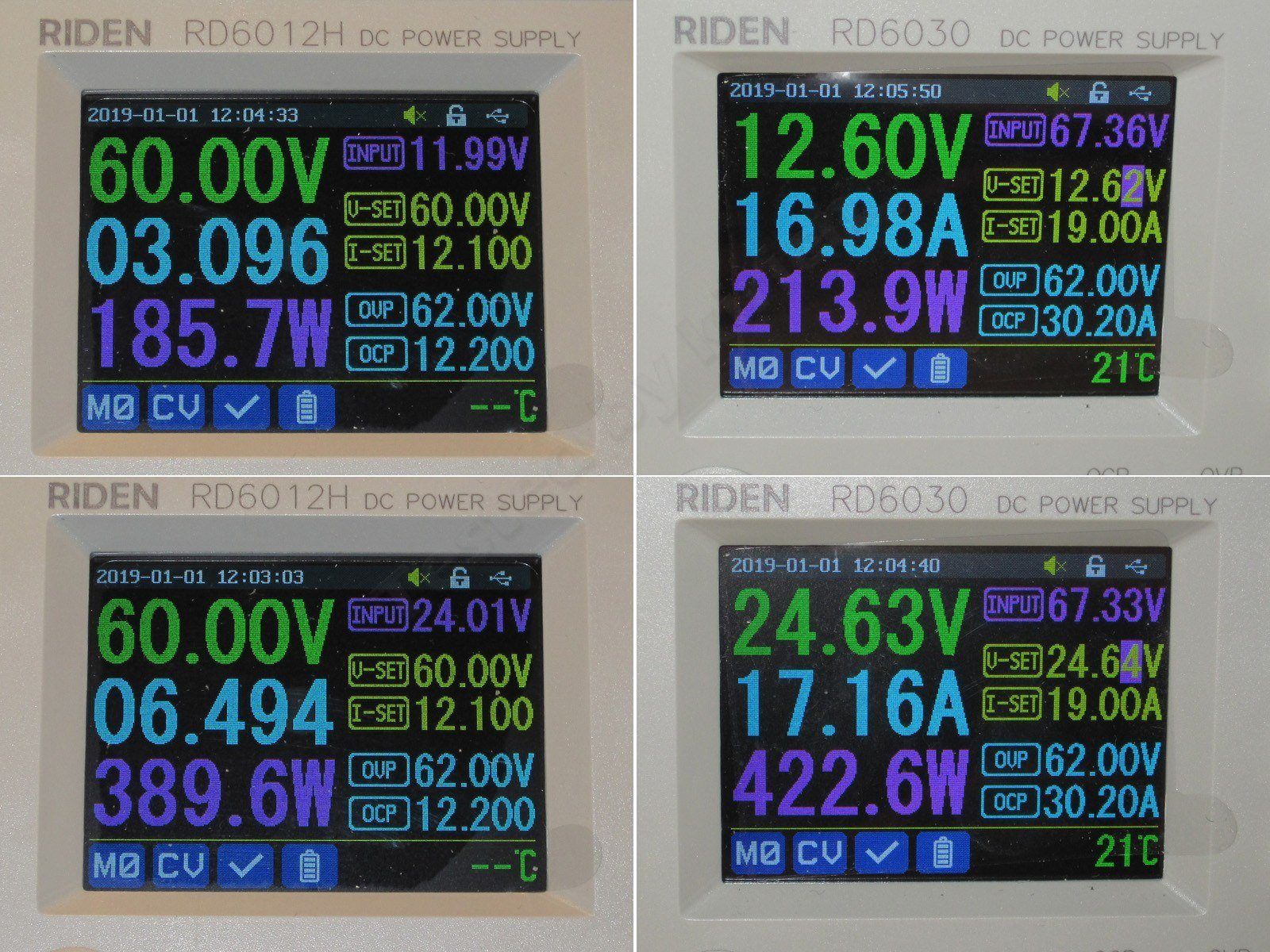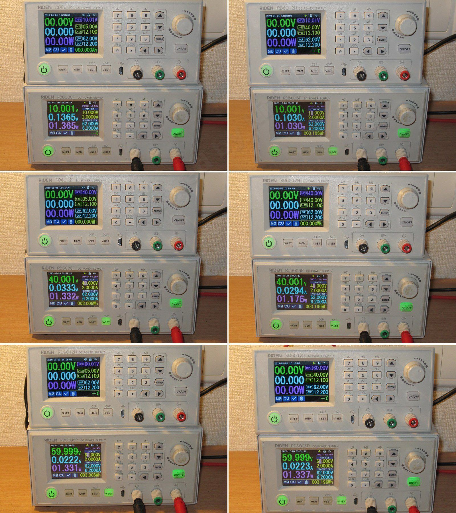 Фотографии сгруппированы попарно, слева RD6012H, справа RD6030, который его питает и можно видеть потребляемый ток.