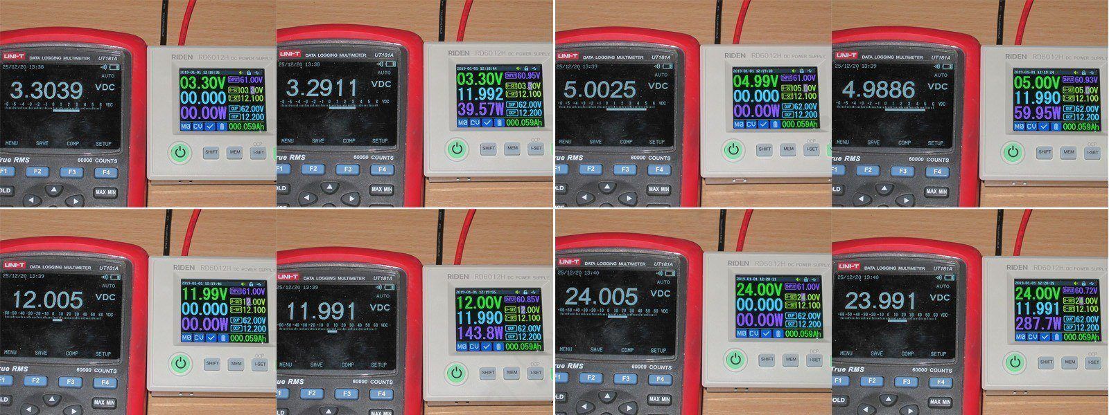 Здесь я задавал напряжения 3.3, 5, 12 и 24 вольта и измерял это значение на клеммах БП без нагрузки и при полных 12А.