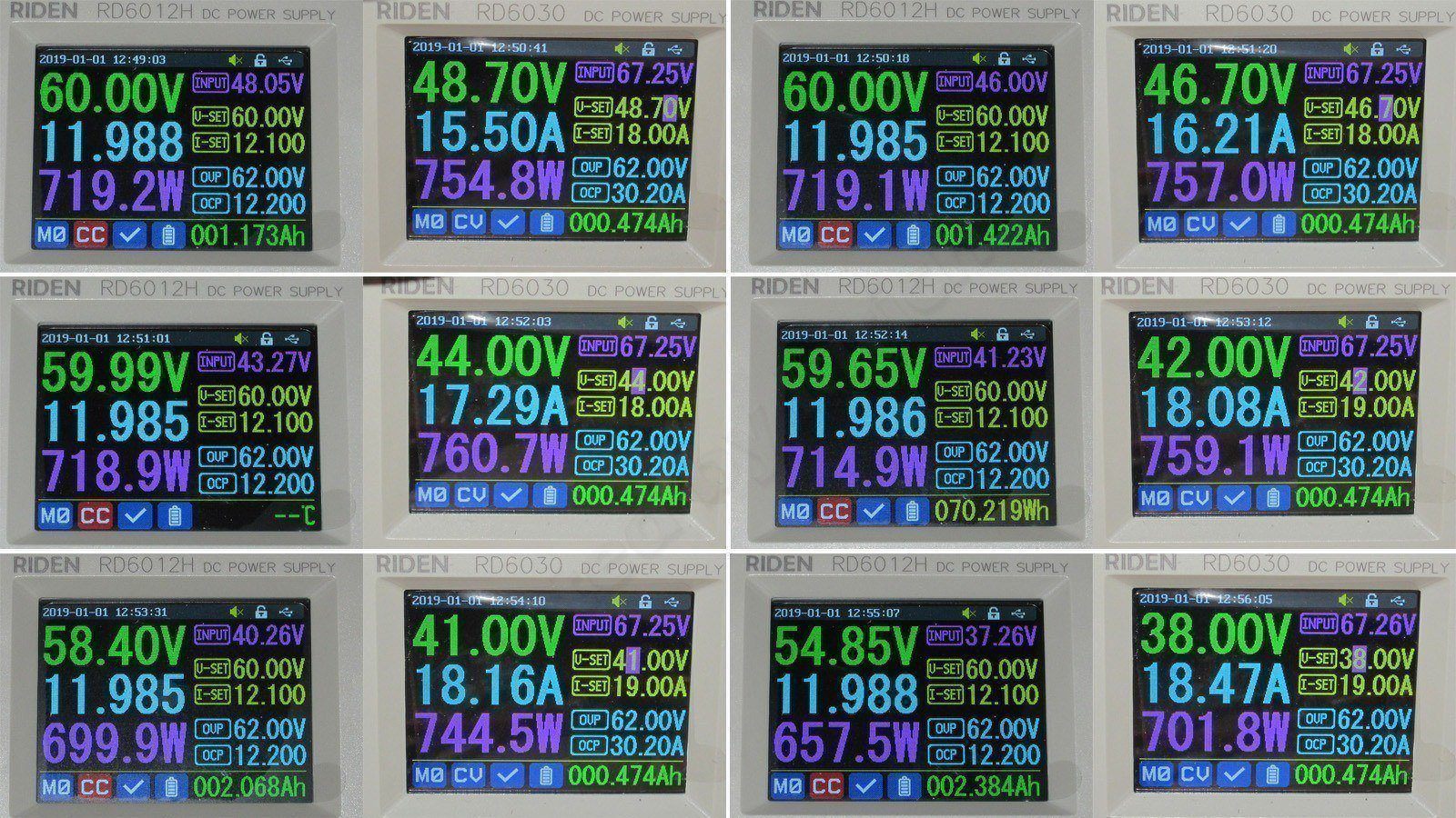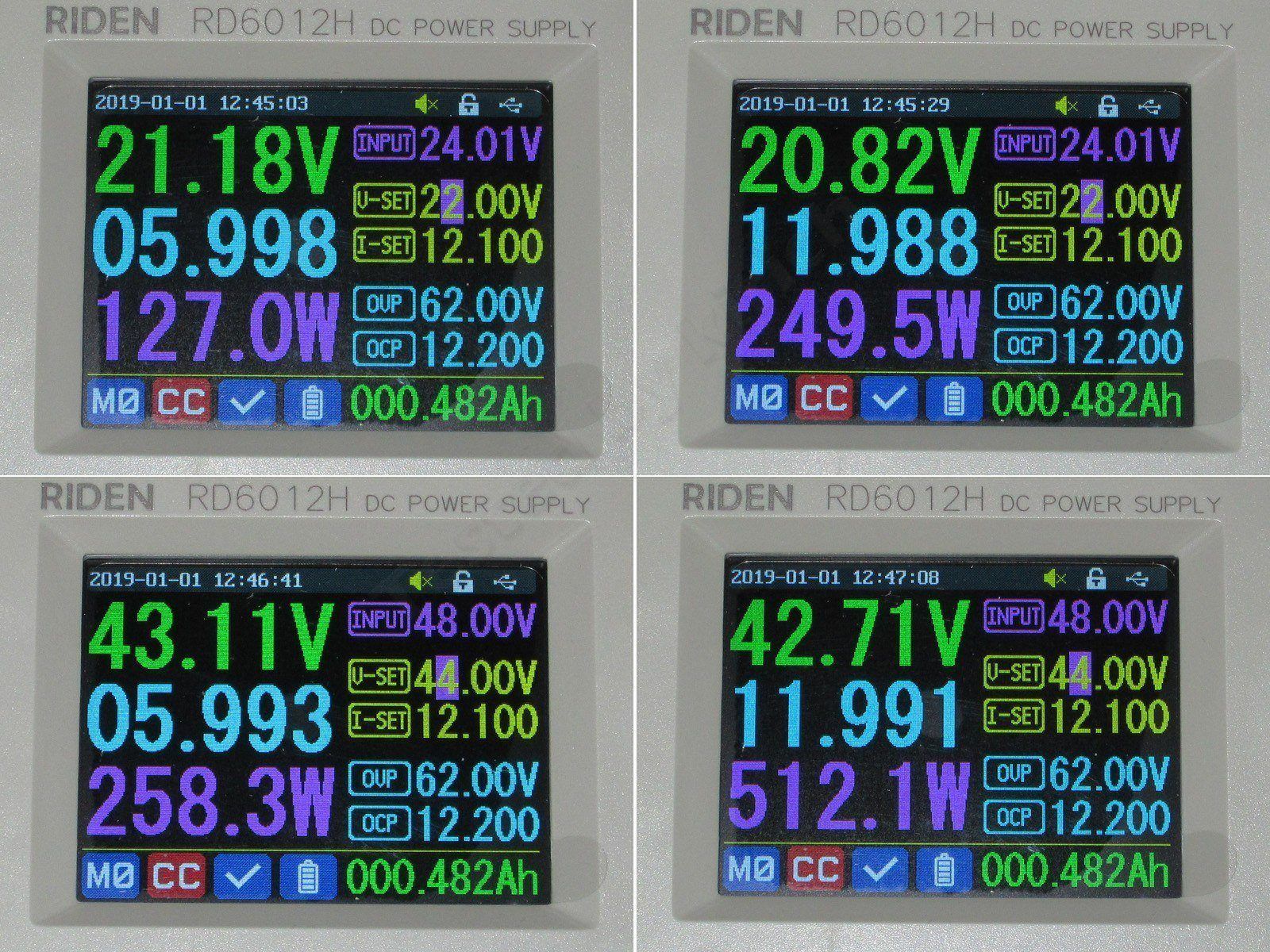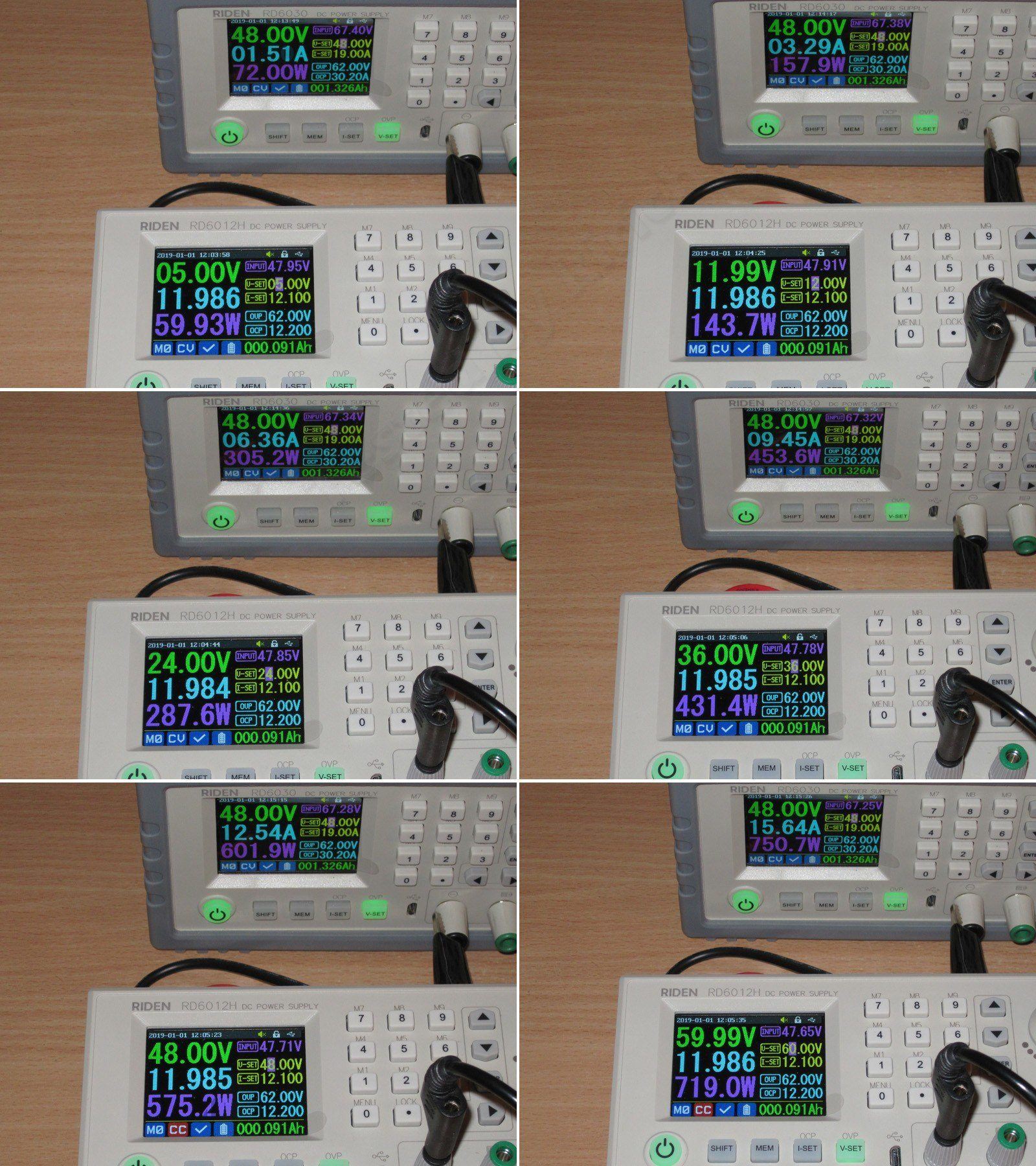 1, 2, 3. При входном 48, 46 и 43.27 все нормально, единственно ток от первичного БП составил около 17.3А. Т.е. примерно до 43-44 вольта RD6012H вполне может обеспечить около 720 ватт на выходе при 60 вольт выходных.