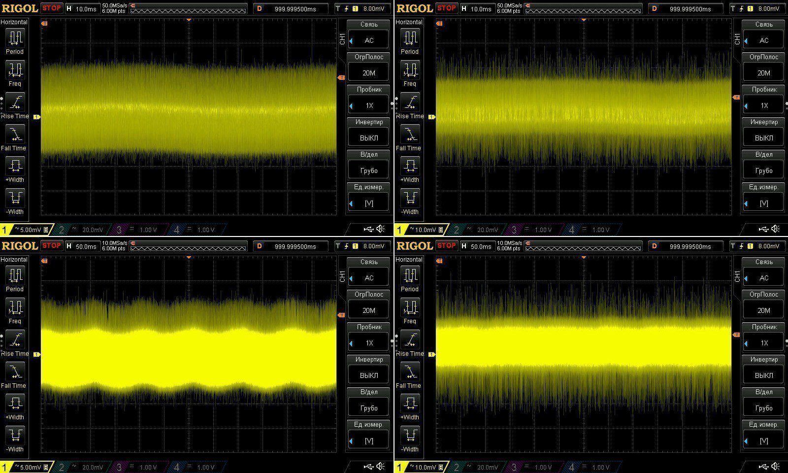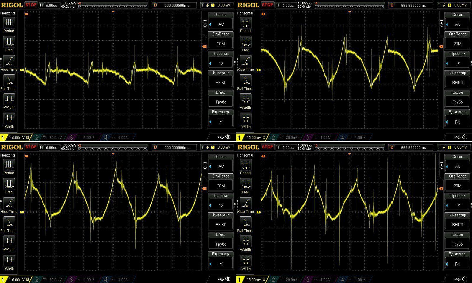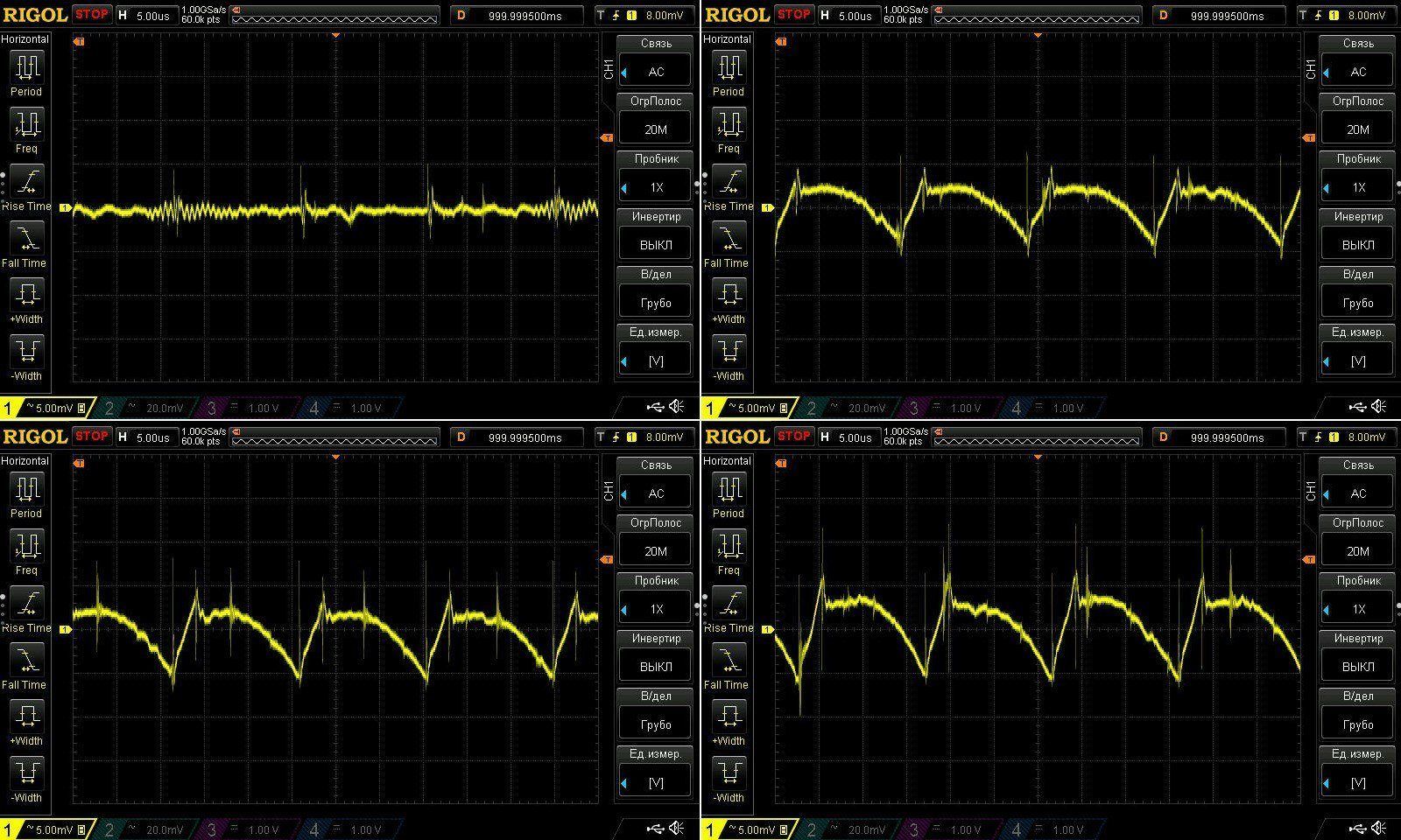 На верхних скринах результаты при 12 и 8 вольт при макс токе и так все в общем-то обычно,от на нижних частота развертки еще в 5 раз меньше и видны небольшие волнообразные колебания напряжения. На самом деле они абсолютно не критичны, да и проявляются в основном при более низком напряжении (лева 12, справа 48 вольт), потому в основном скорее любопытны. Возможно имеется какие-то биения между частотами работы двух DCDC.