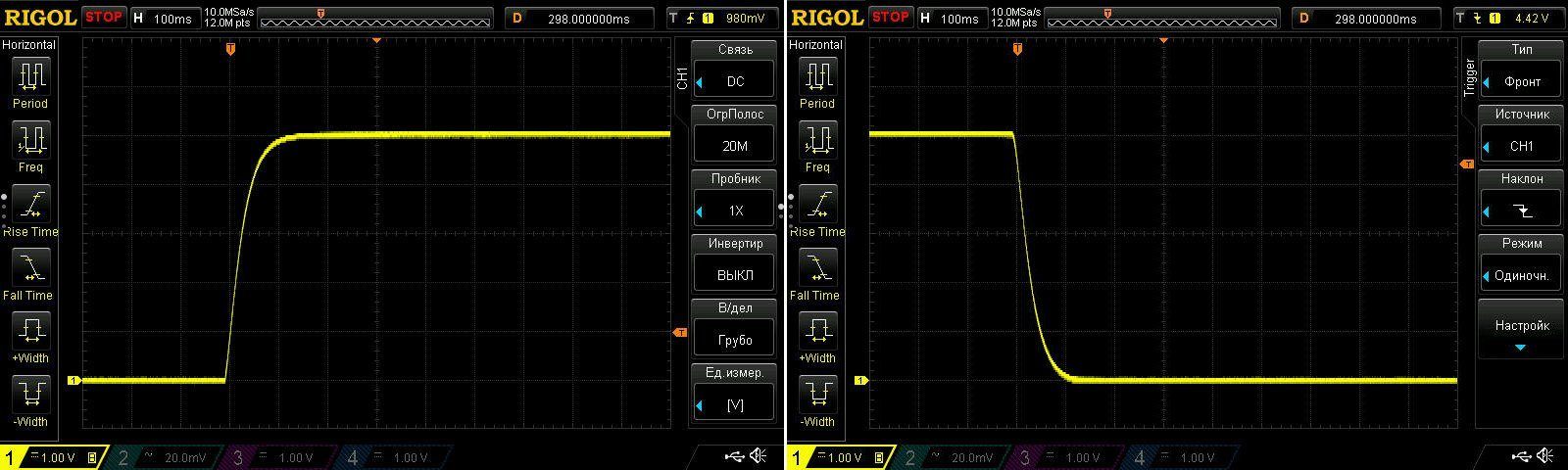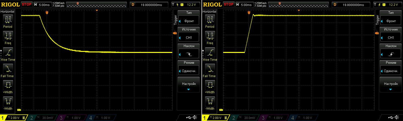 Подача и снятие 5 вольт на выходе, все красиво и без нареканий. Также проверил отсутствие выбросов при подаче/снятии питания с преобразователя, здесь также без нареканий.
