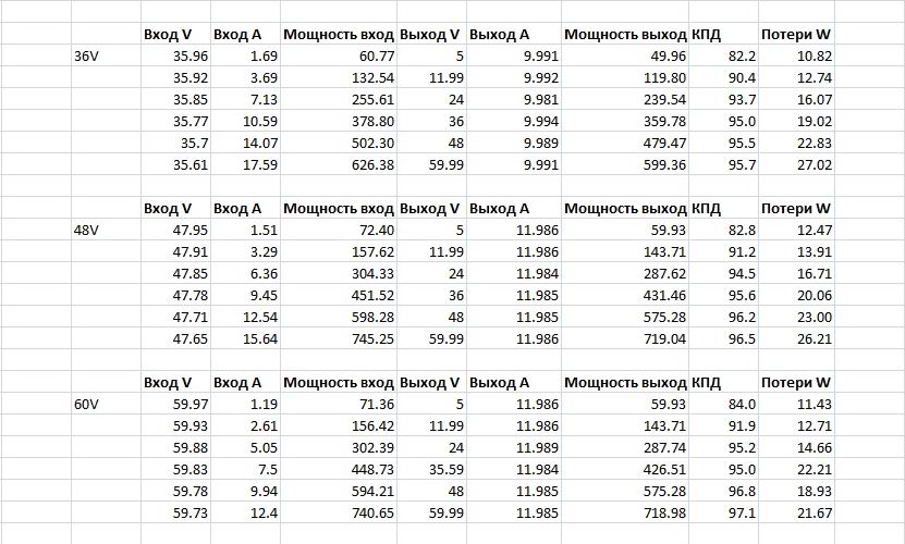 Так как преобразователь "хитрый", то тест проводился в три этапа, при входном напряжении 36, 48 и 60 вольт, и выходных напряжениях 5, 12, 24, 36, 48 и 60 вольт, при этом в случае питания от 36 вольт ток нагрузки был 10А, а при 48 и 60 вольт при полных 12А.