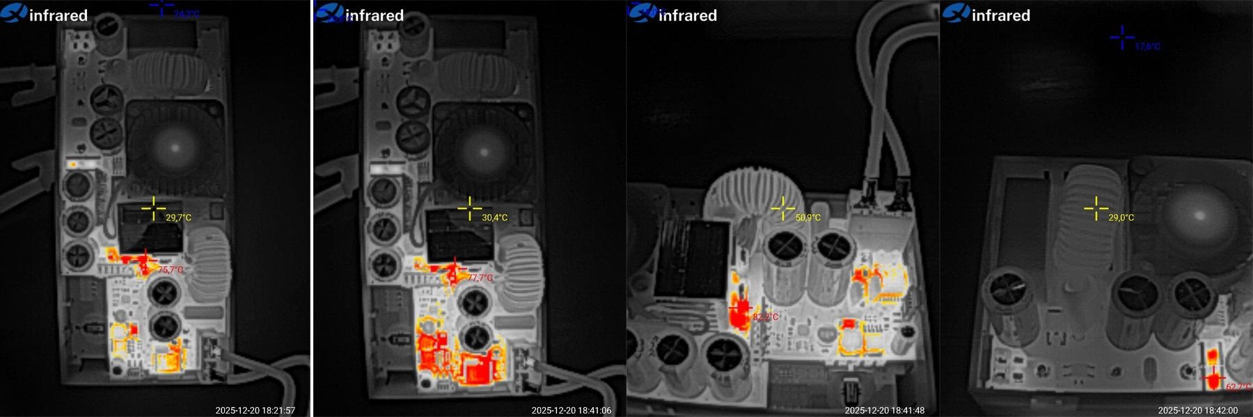 Тест длился немного больше 20 минут, первое фото почти в самом начале теста, последующие три спустя 20 минут. преобразователь лежал на столе платой вверх. в корпусе картина была бы конечно похуже, но думаю не глобально.
