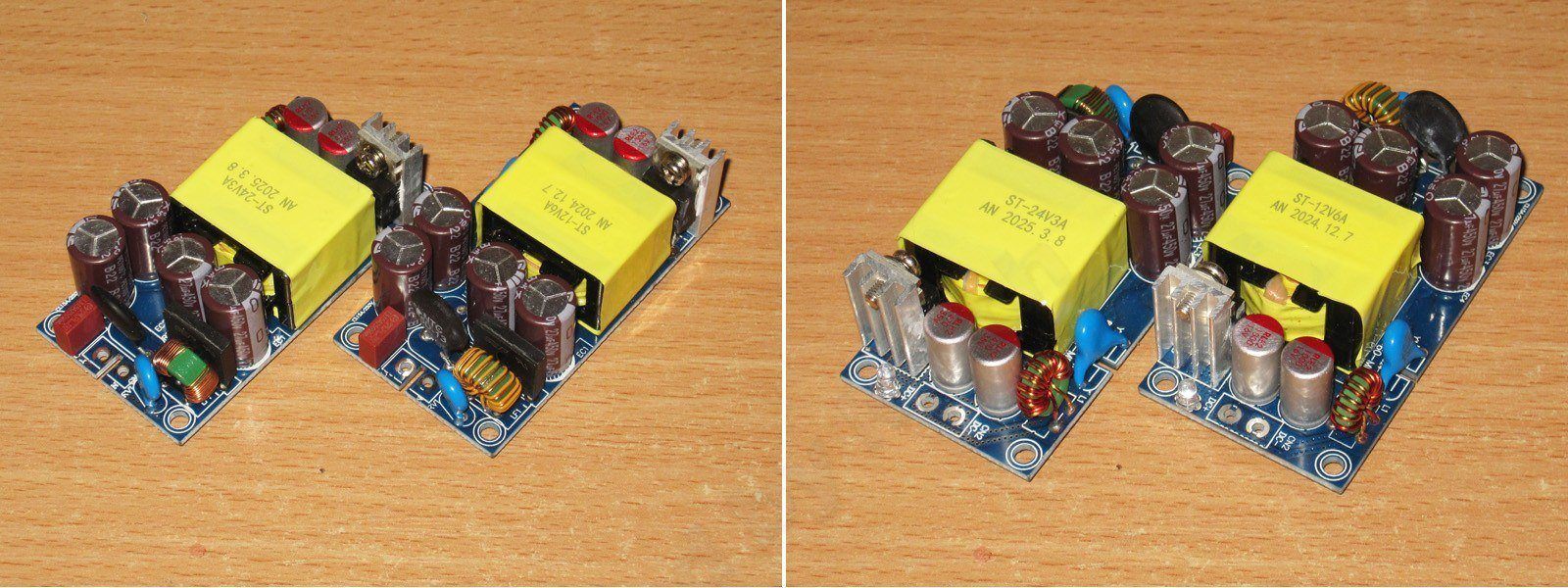 Для демонстрации и тестов я отобрал три штучки, два на 12 и один на 24 вольта. Вообще я покупаю обычно на 12 вольт, причем под переделку, но пару штук взял под 24 вольта, они при такой мощности отлично пойдут либо в БП паяльной станции, либо в какое-то зарядное устройство.