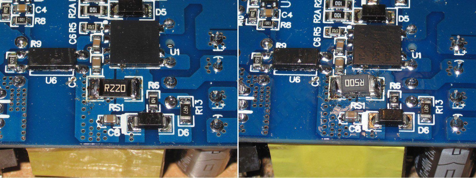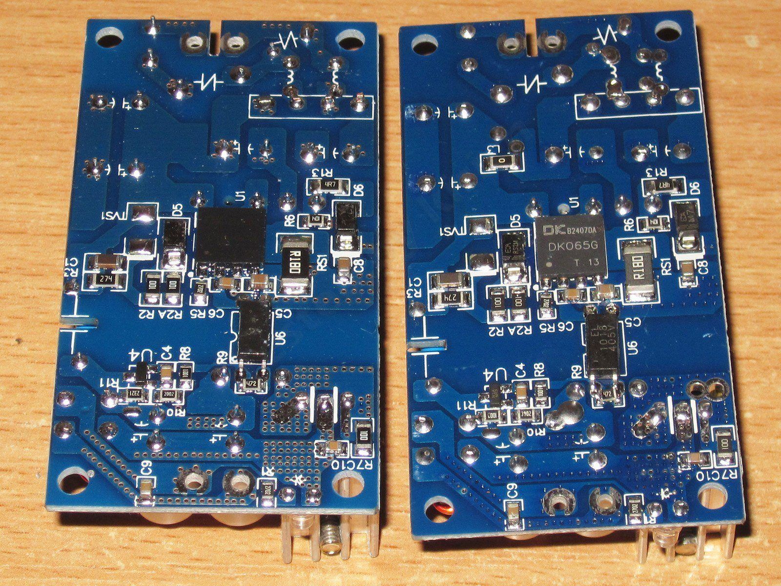 По сути отличие между ревизиями, которое я заметил, заключается в том, что у одного заложено место на дроссель между высоковольтными конденсаторами, но стоит перемычка, а у другого место для дросселя отсутствует.