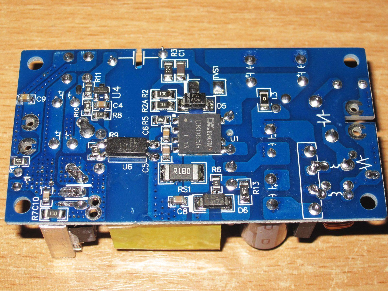 Для демонстрации взял плату без лака, так все таки лучше видно. И здесь видно вполне качественную сборку, а также чип ШИМ контроллера - DK065G, это ШИМ со встроенным высоковольтным транзистором и внешним токоизмерительным шунтом, позиционируется для блоков мощностью до 65 ватт, есть точно такие же, но под меньшую мощность и он действительно заявлен как чип на базе нитрида галлия.