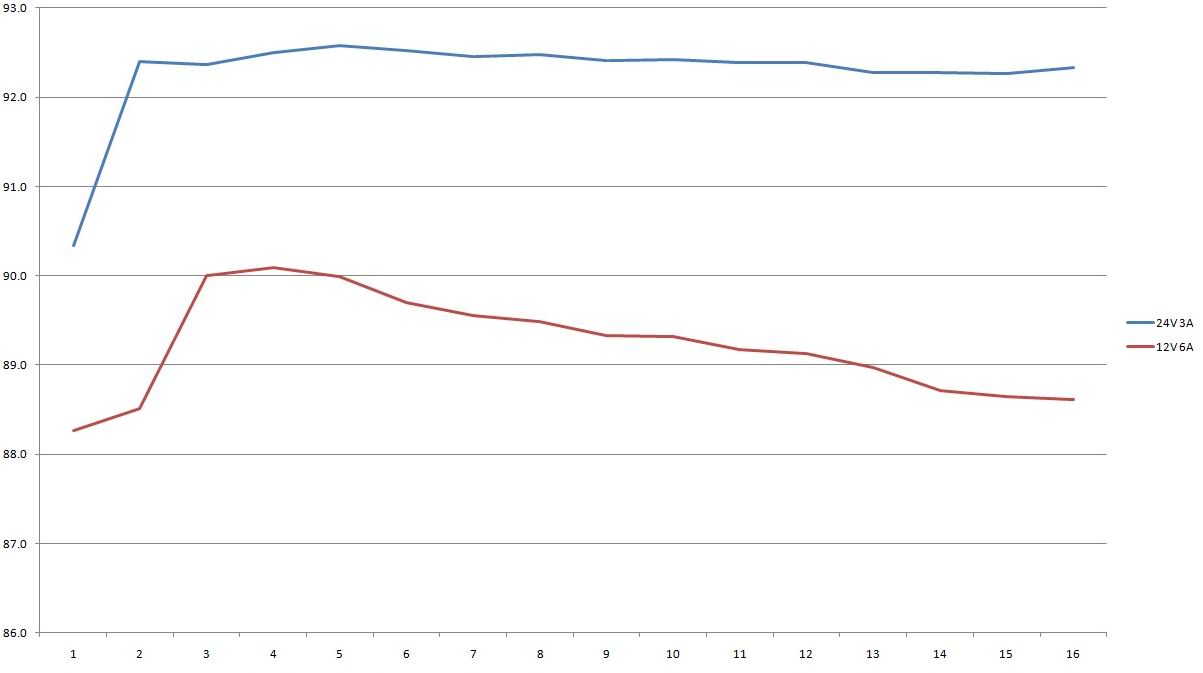 Результаты измерения КПД. В даташите писали что КПД выше 88% при полной нагрузке, и это таки правда, а у 24 вольта версии и того выше, почти 92.5%, просто отлично для относительно недорогого блока питания.