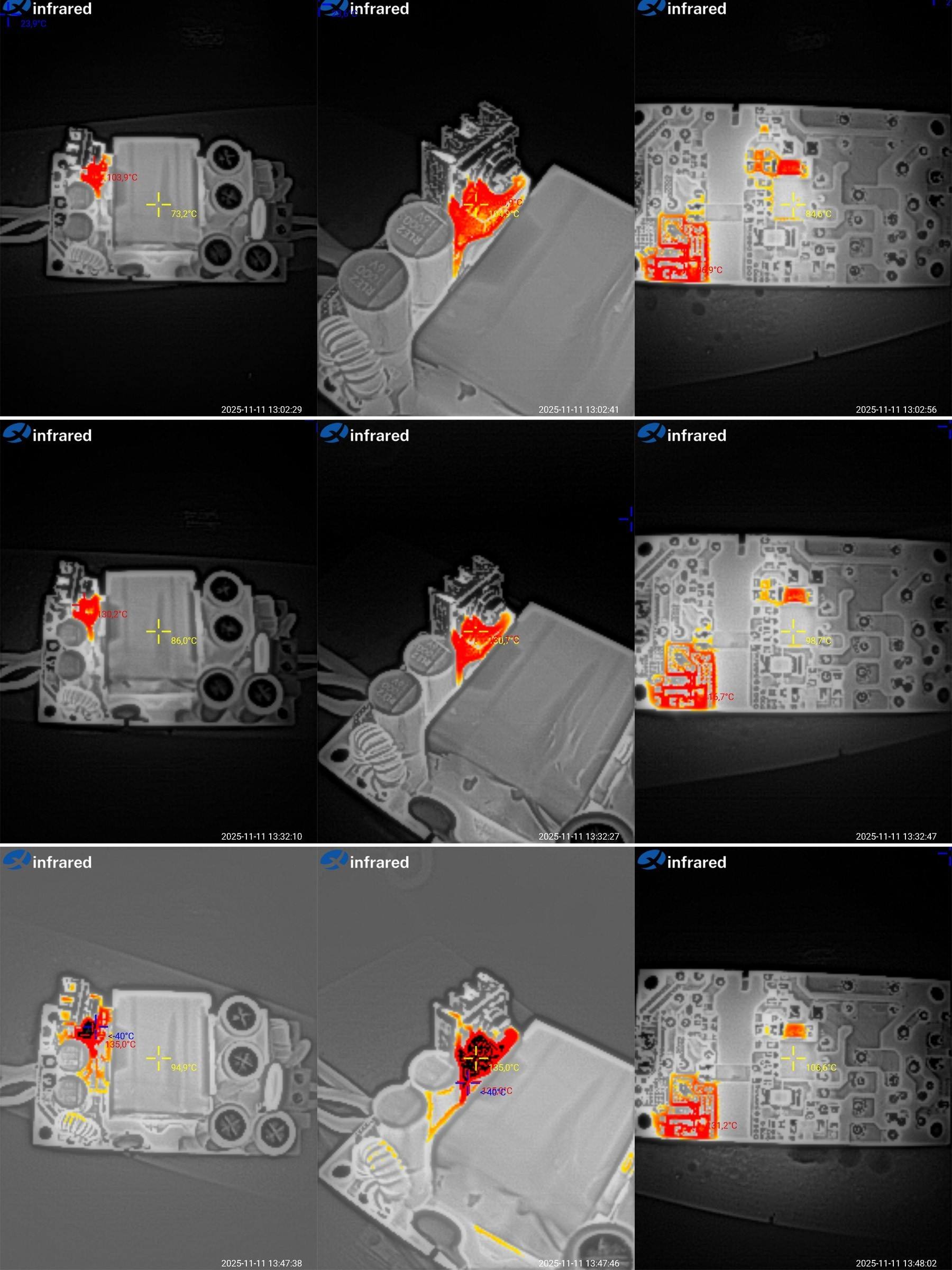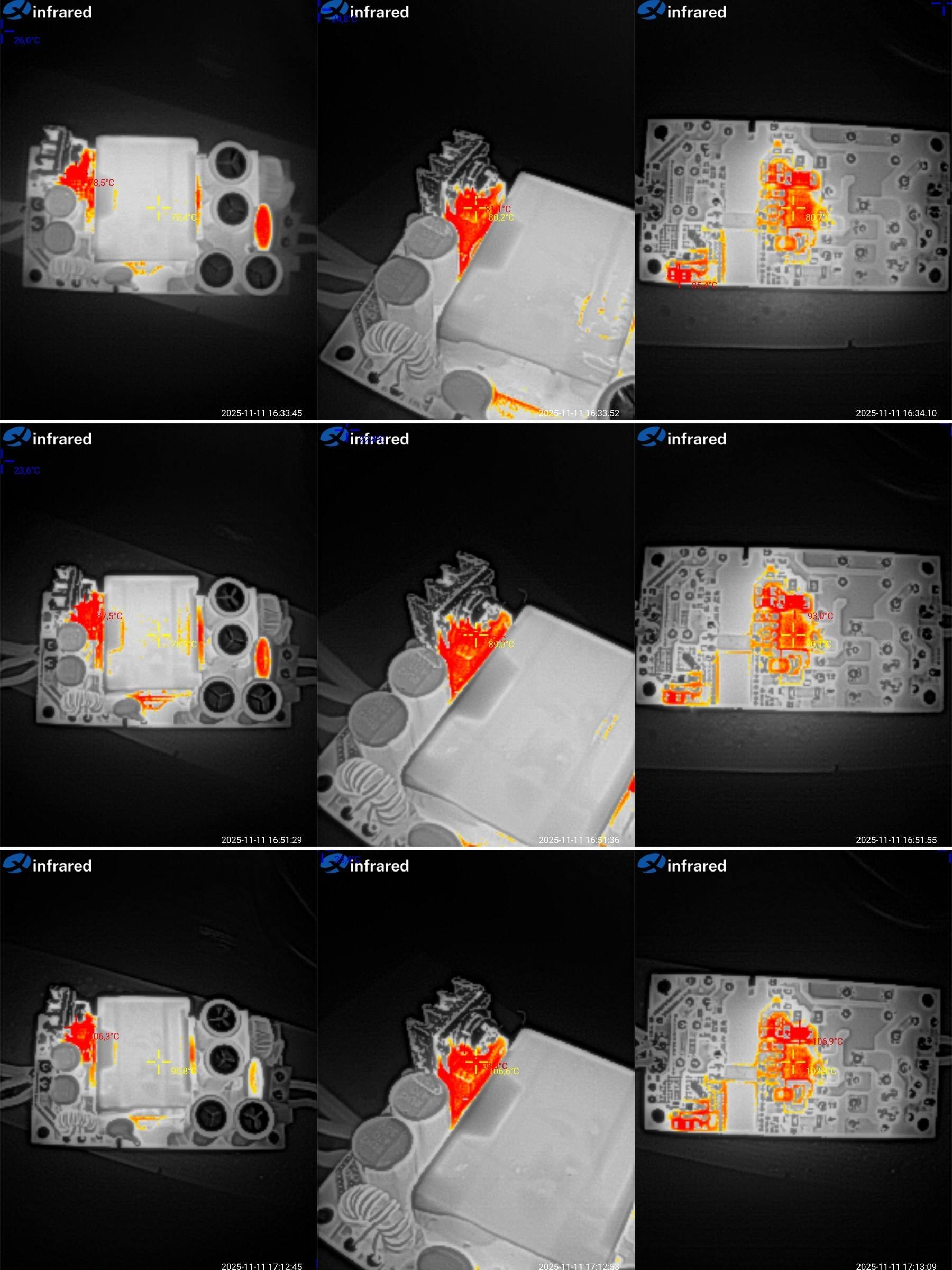 При 6А уже есть признаки перегрева, трансформатор 95, здесь отлично, диод более 135 (тепловизор зашкаливает), ШИМ 107 градусов, многовато.