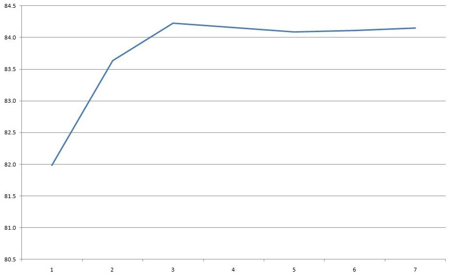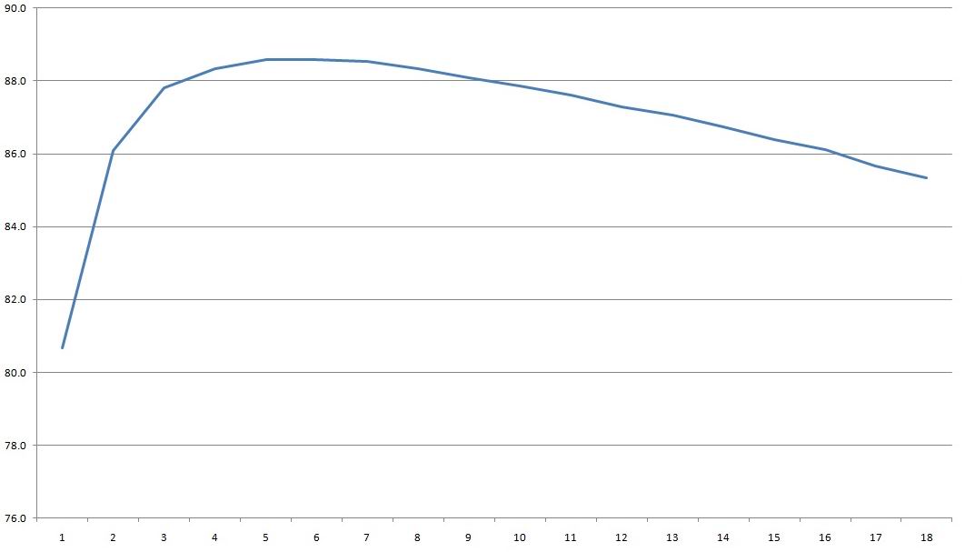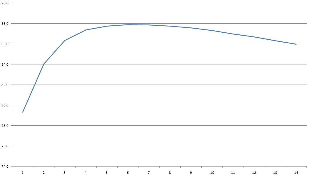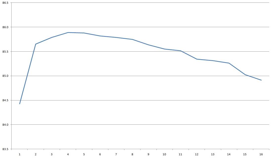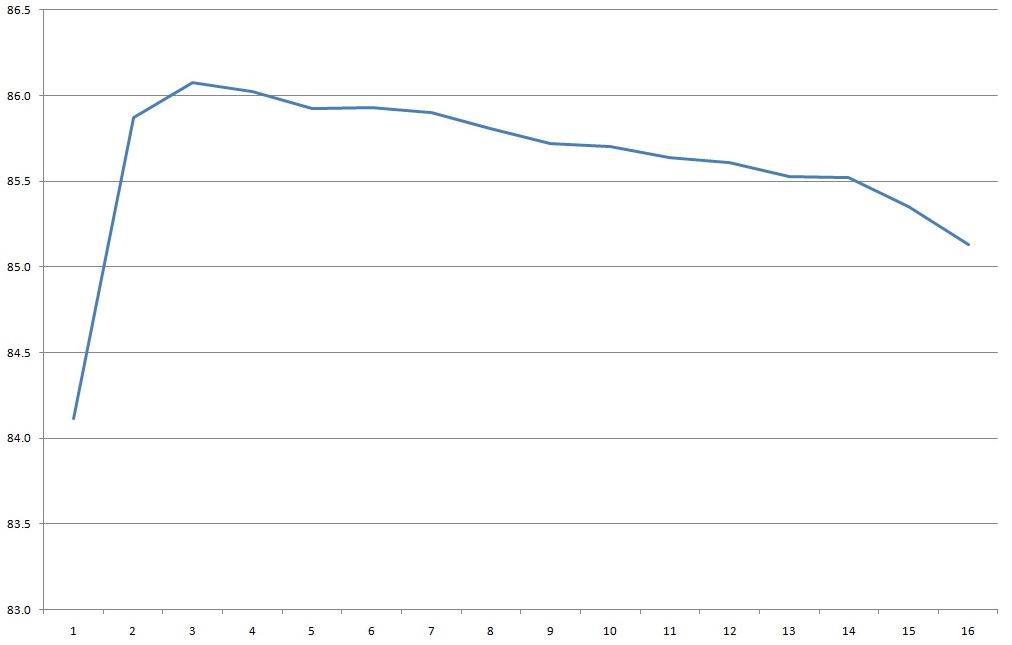 КПД в диапазоне 2-28А кратно 2 ампера, и должен сказать что средние примерно 87% это вполне даже неплохо, а если грузить на 14-15А, то будем иметь почти 88%.