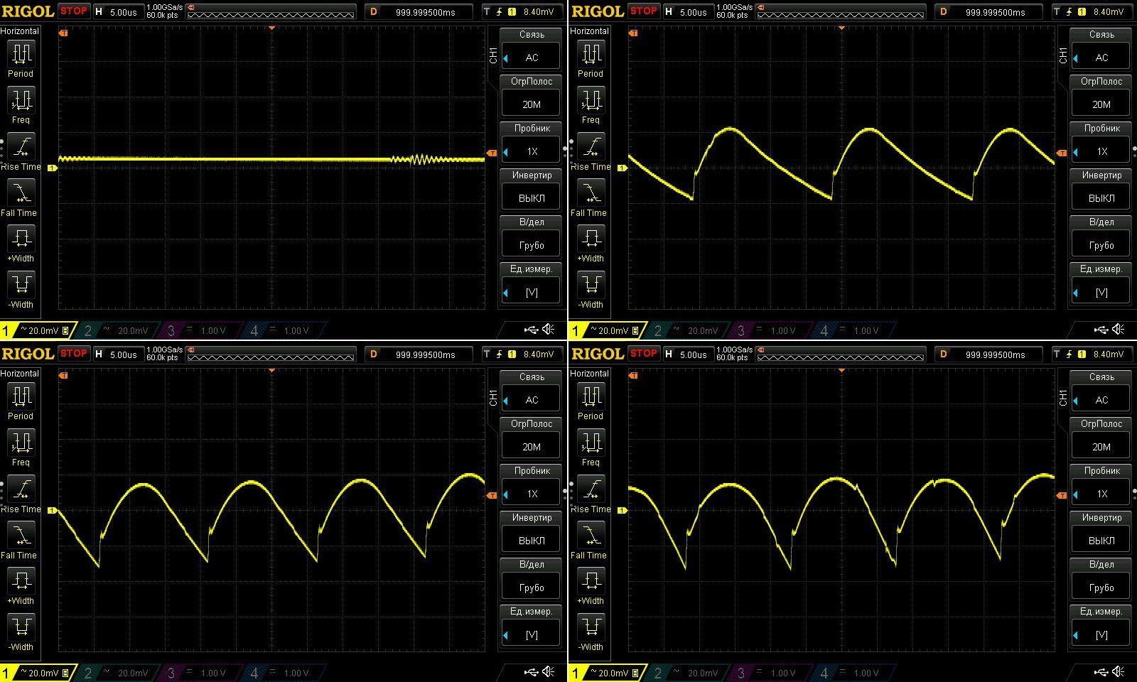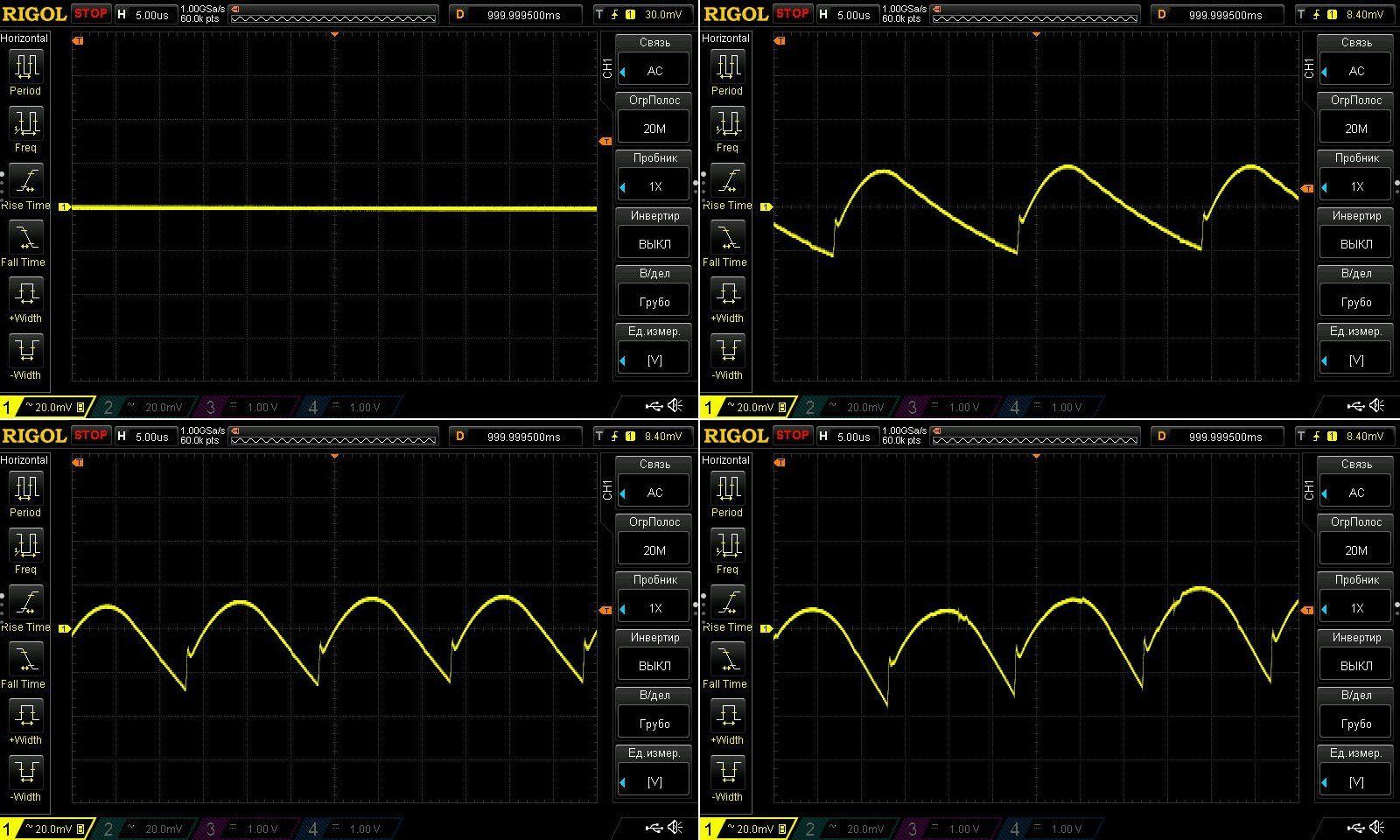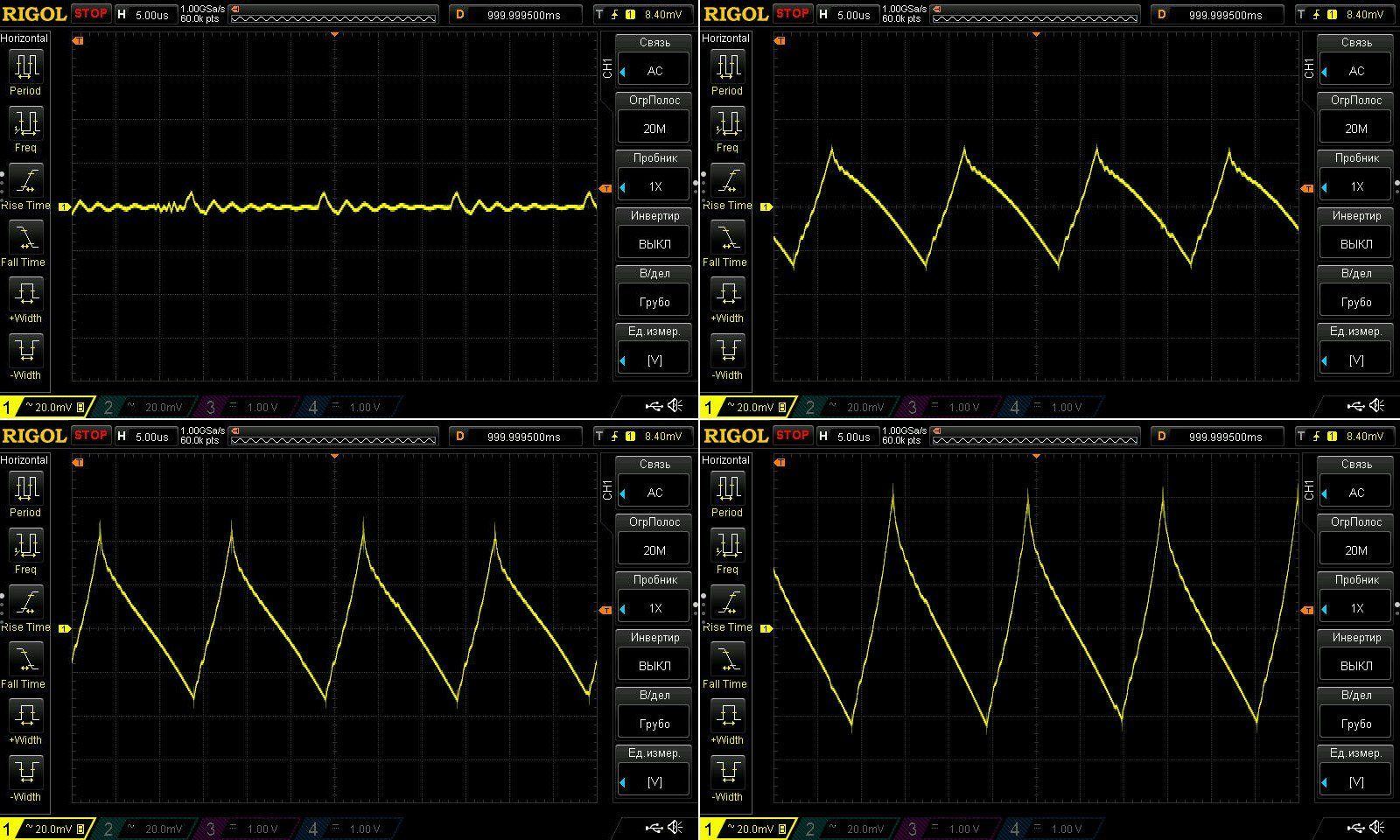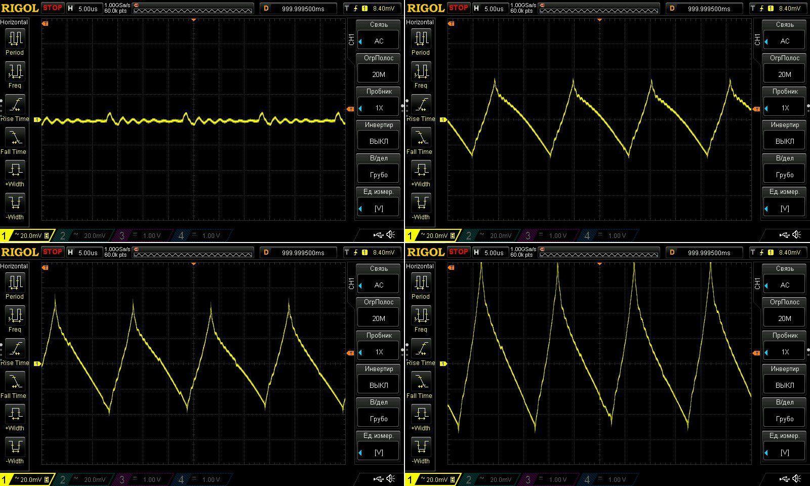 Пульсации без нагрузки и при токах 1, 2 и 3А.