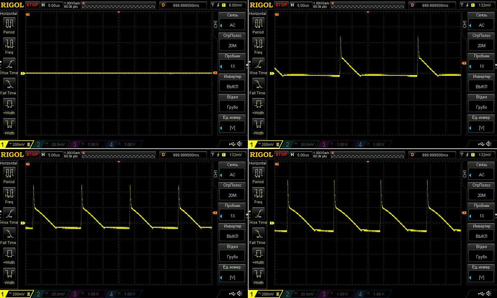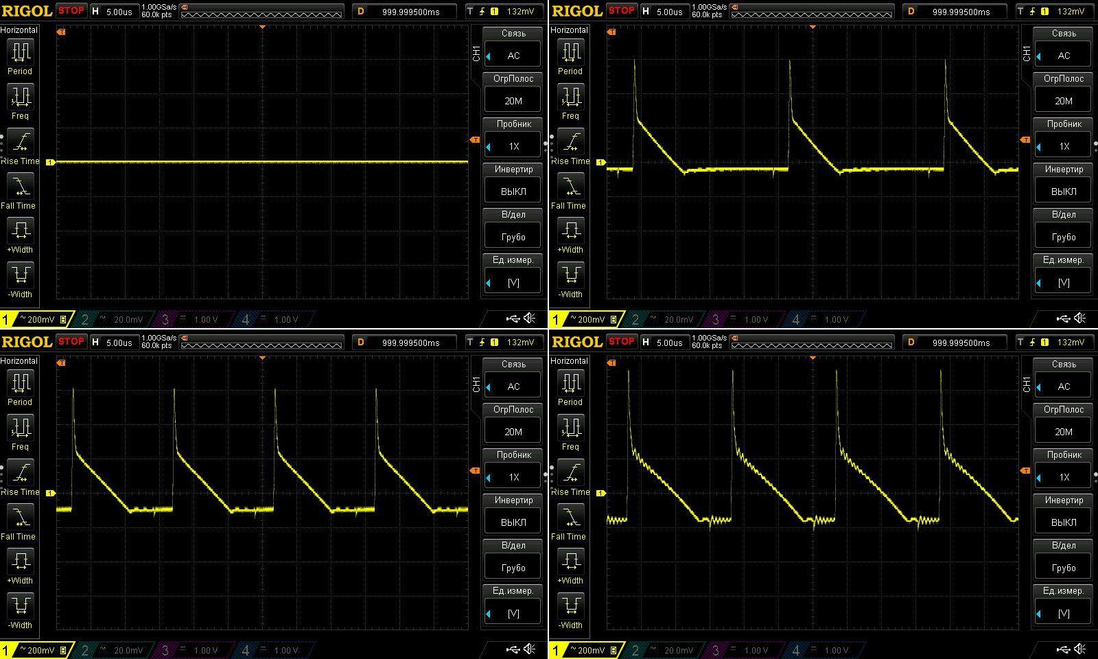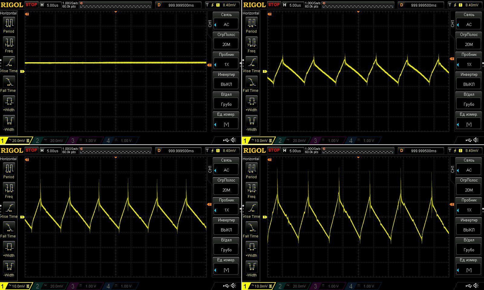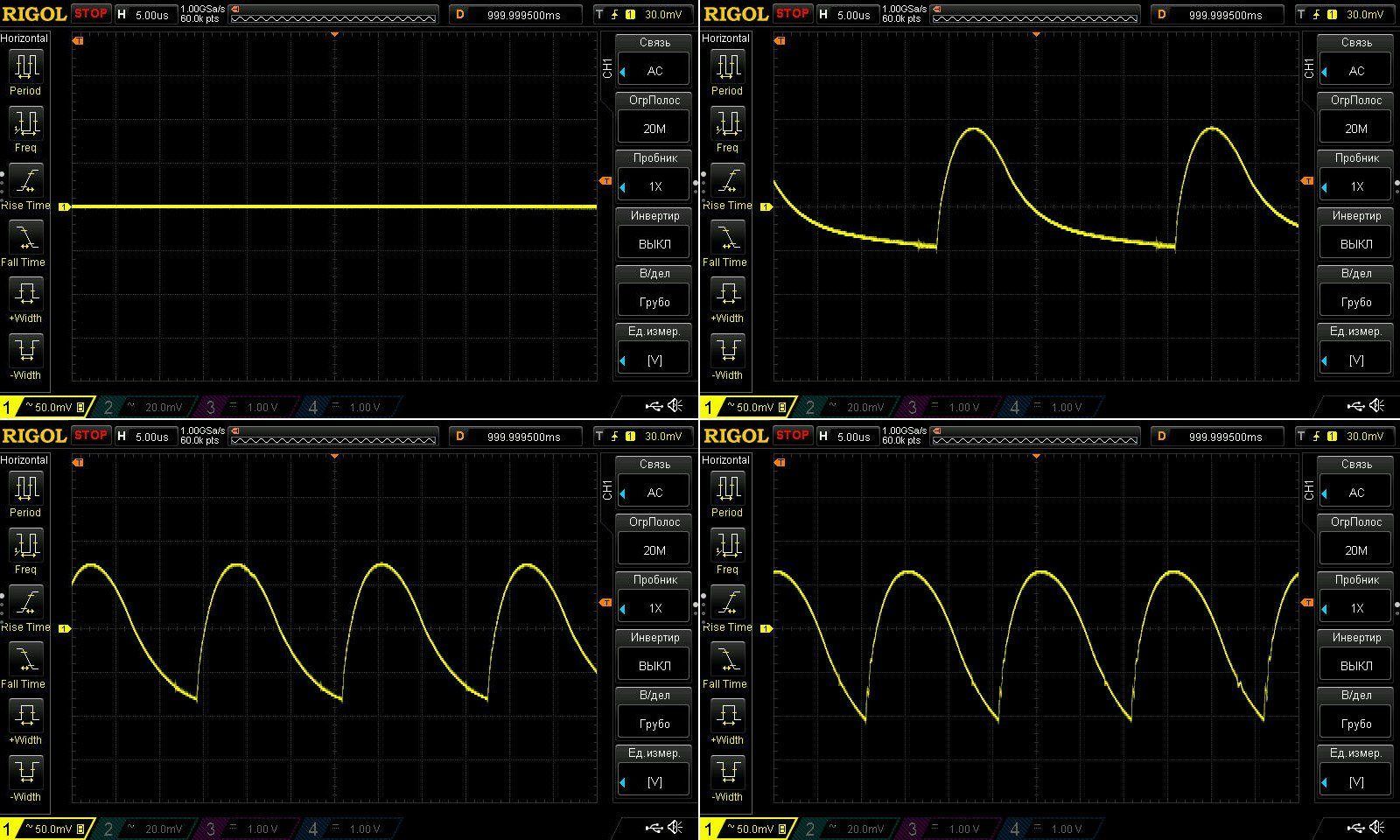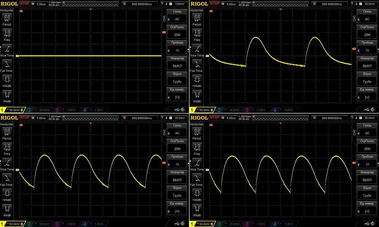 Пульсации без нагрузки и при токах 1, 2 и 3А.