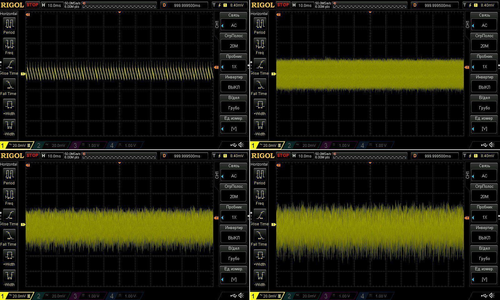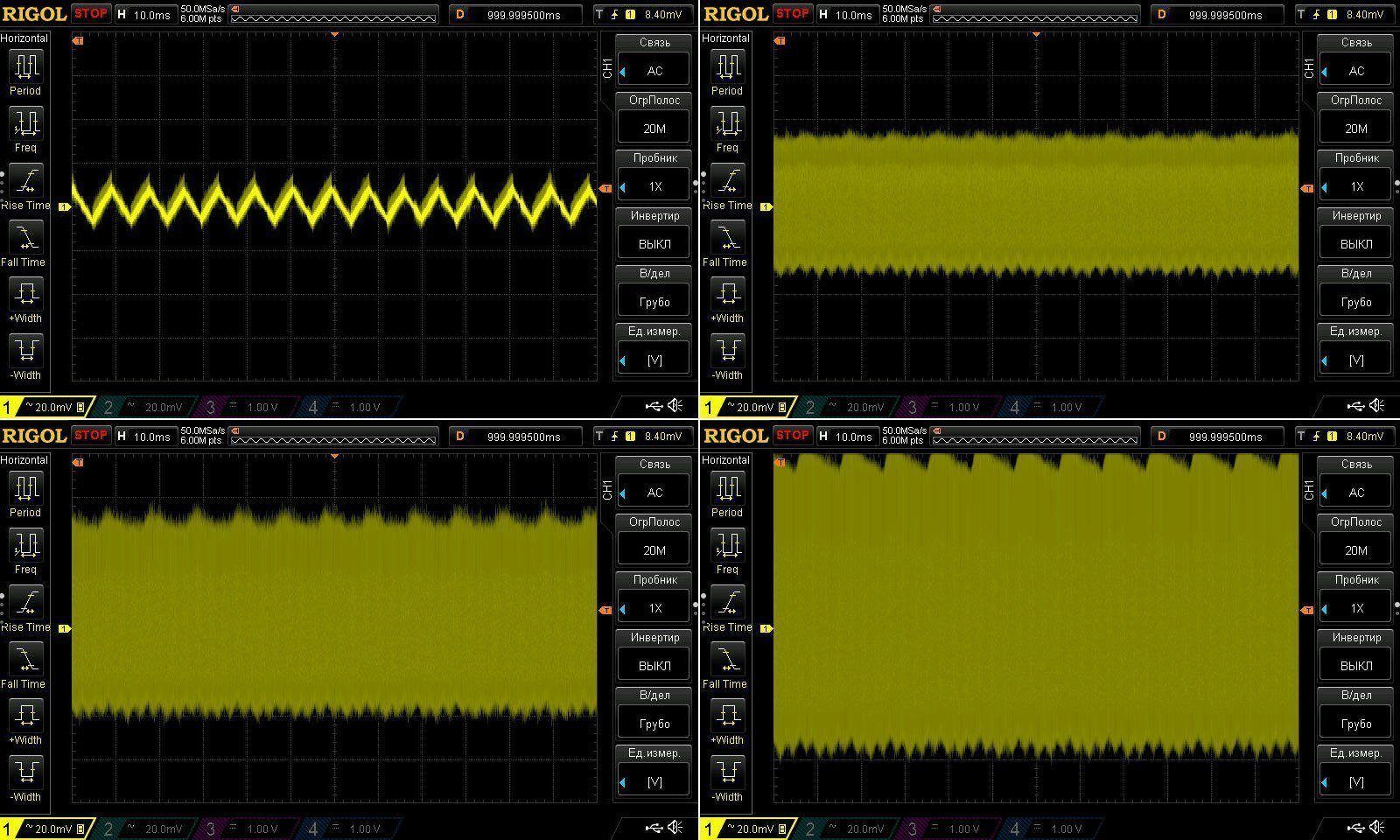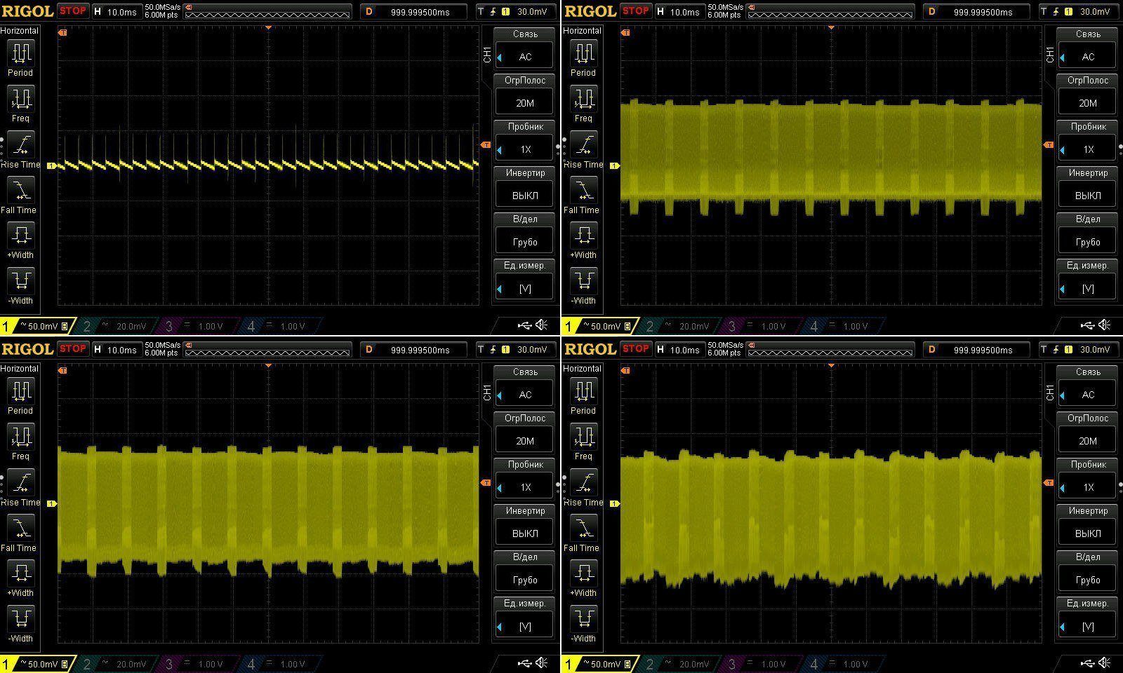 Пульсации без нагрузки и при 3, 6 и 10А. Результаты идентичны, у 100 ватт при 9А было 45мВ, здесь при 10А имеем ближе к 50мВ.