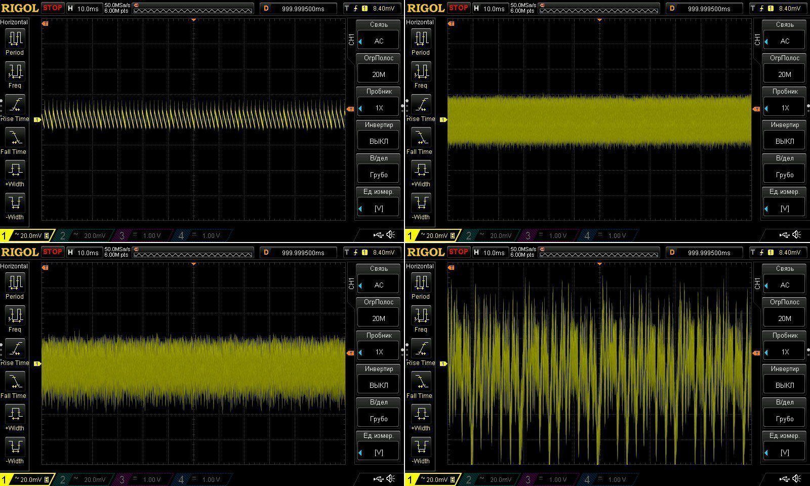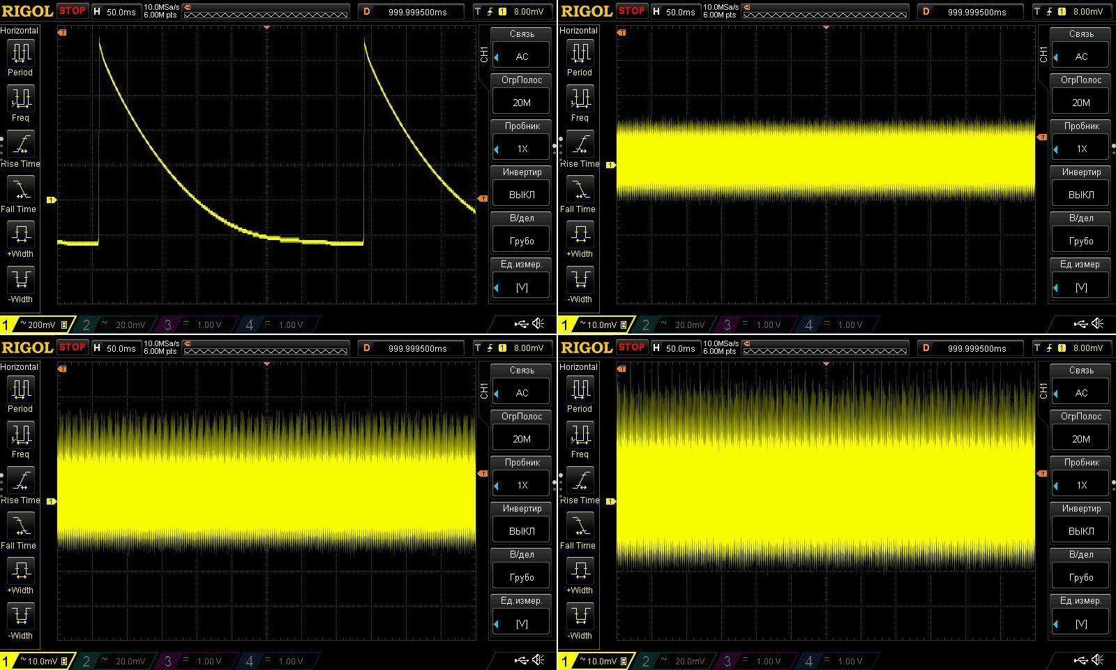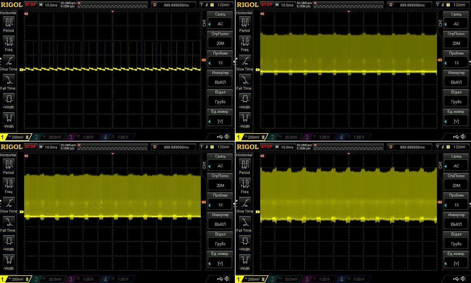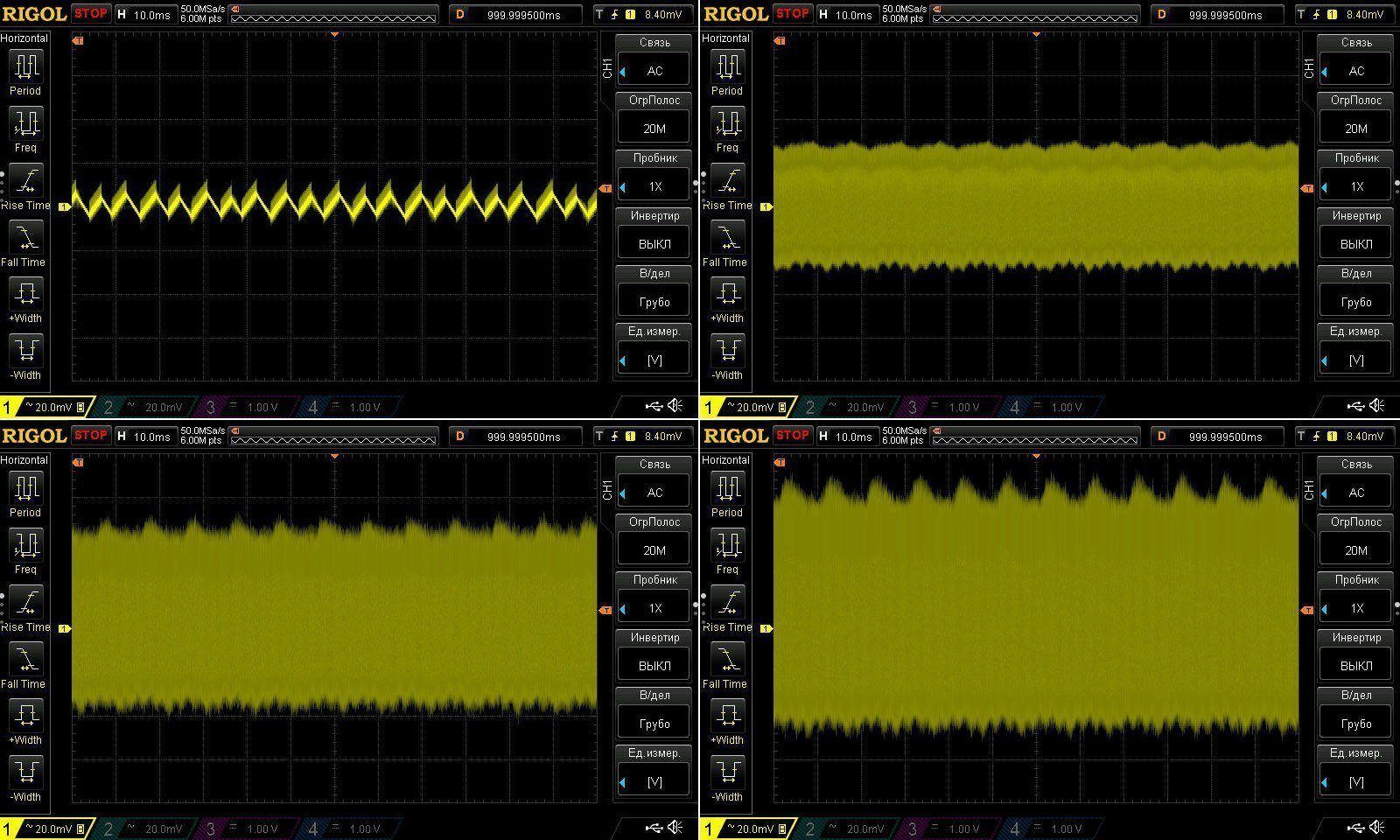 Пульсации без нагрузки и при 3, 6 и 10А. Результаты идентичны, у 100 ватт при 9А было 45мВ, здесь при 10А имеем ближе к 50мВ.