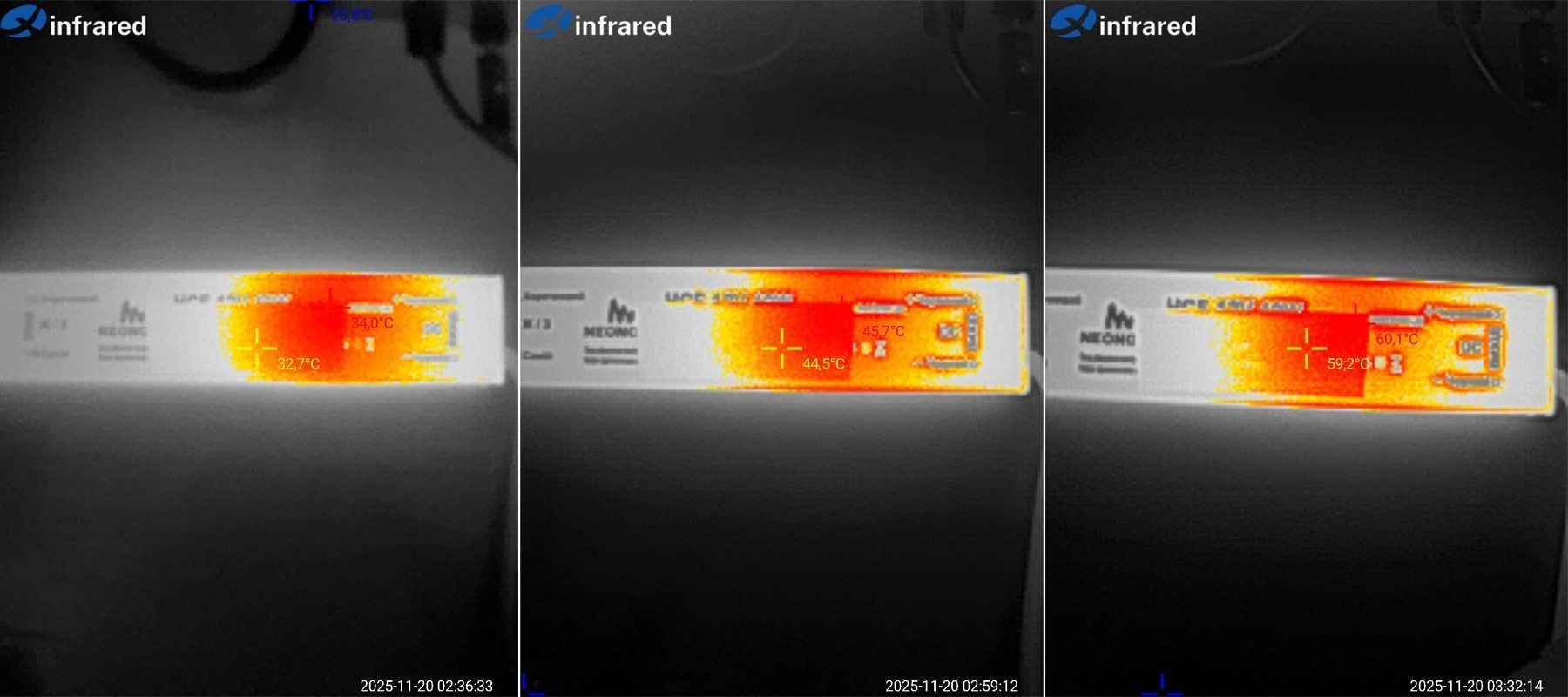 Результаты соответственно при тех же 33, 66 и 99% мощности. Корпус был заметно горячий, около 60 градусов, только при макс мощности, ну а то, что корпус горячий, это даже хорошо, значит тепло уходит от компонентов на его поверхность, а не запирается внутри.