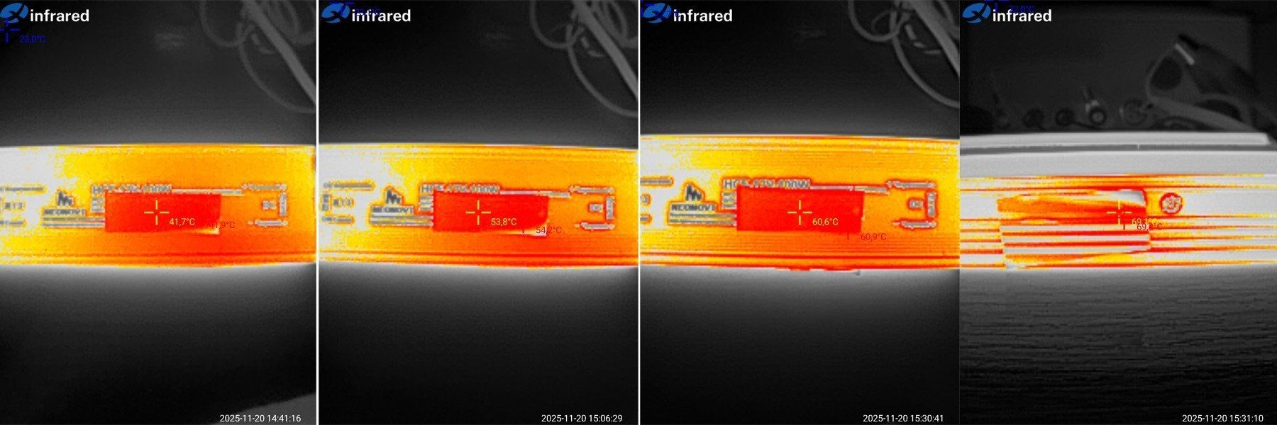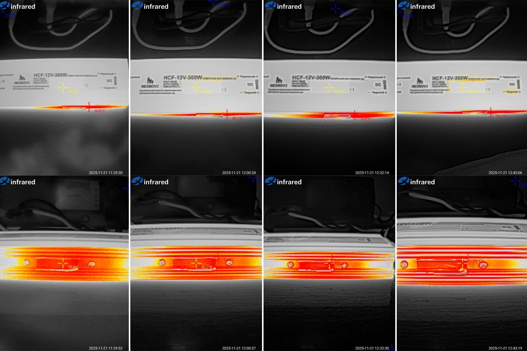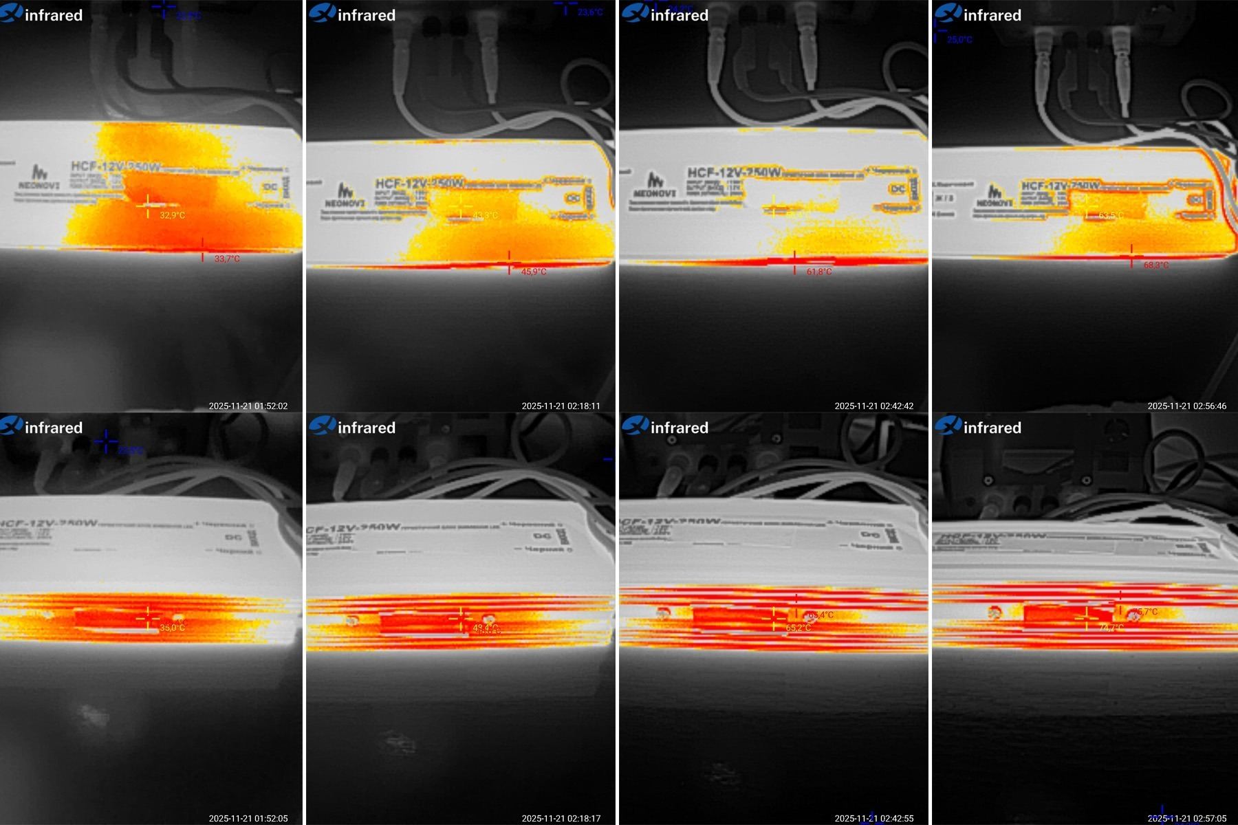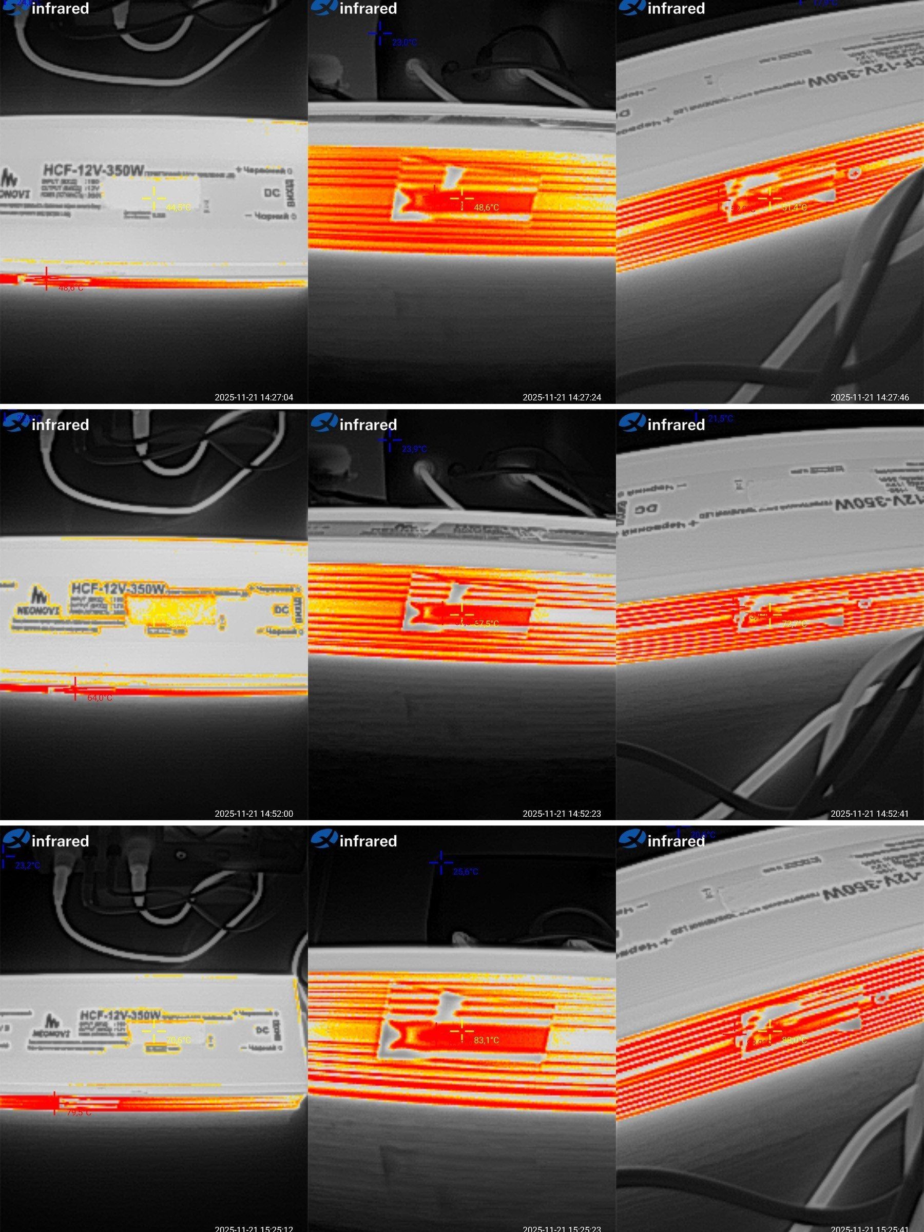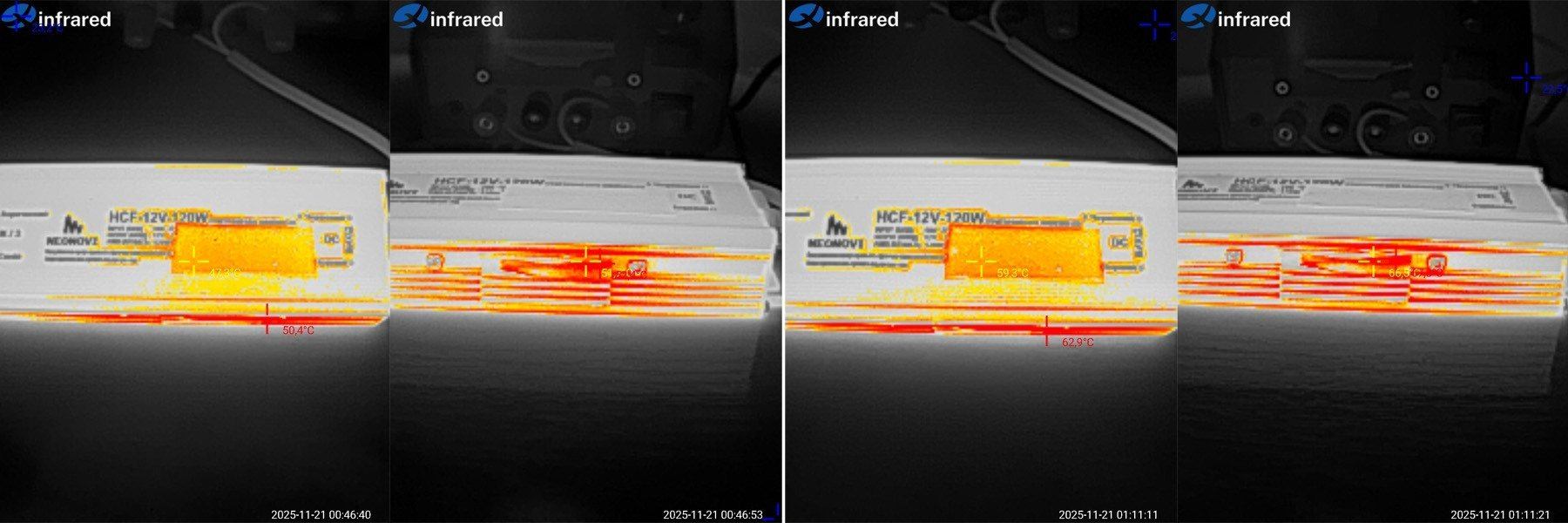 Сразу забыл пояснить, так как корпуса блоков питания из алюминия, то измерялась не просто температура корпуса, а температура наклеенного кусочка изоленты, для корректности измерений.