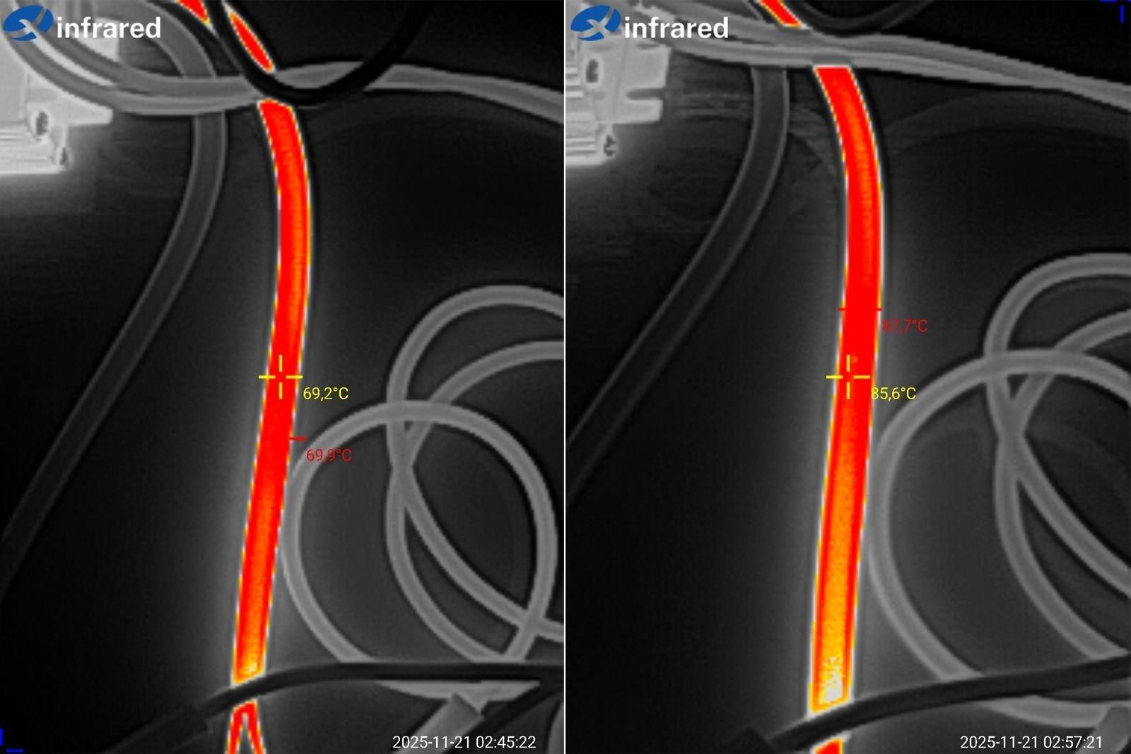 Температура корпуса и боковой грани при токах 7 и 10А. При токе 10А на боковой грани я получил 66.5 градуса, у 100 ватт модели было 69 градусов, но там тест был в четыре этапа, возможно из-за этого корпус прогрелся чуть больше.