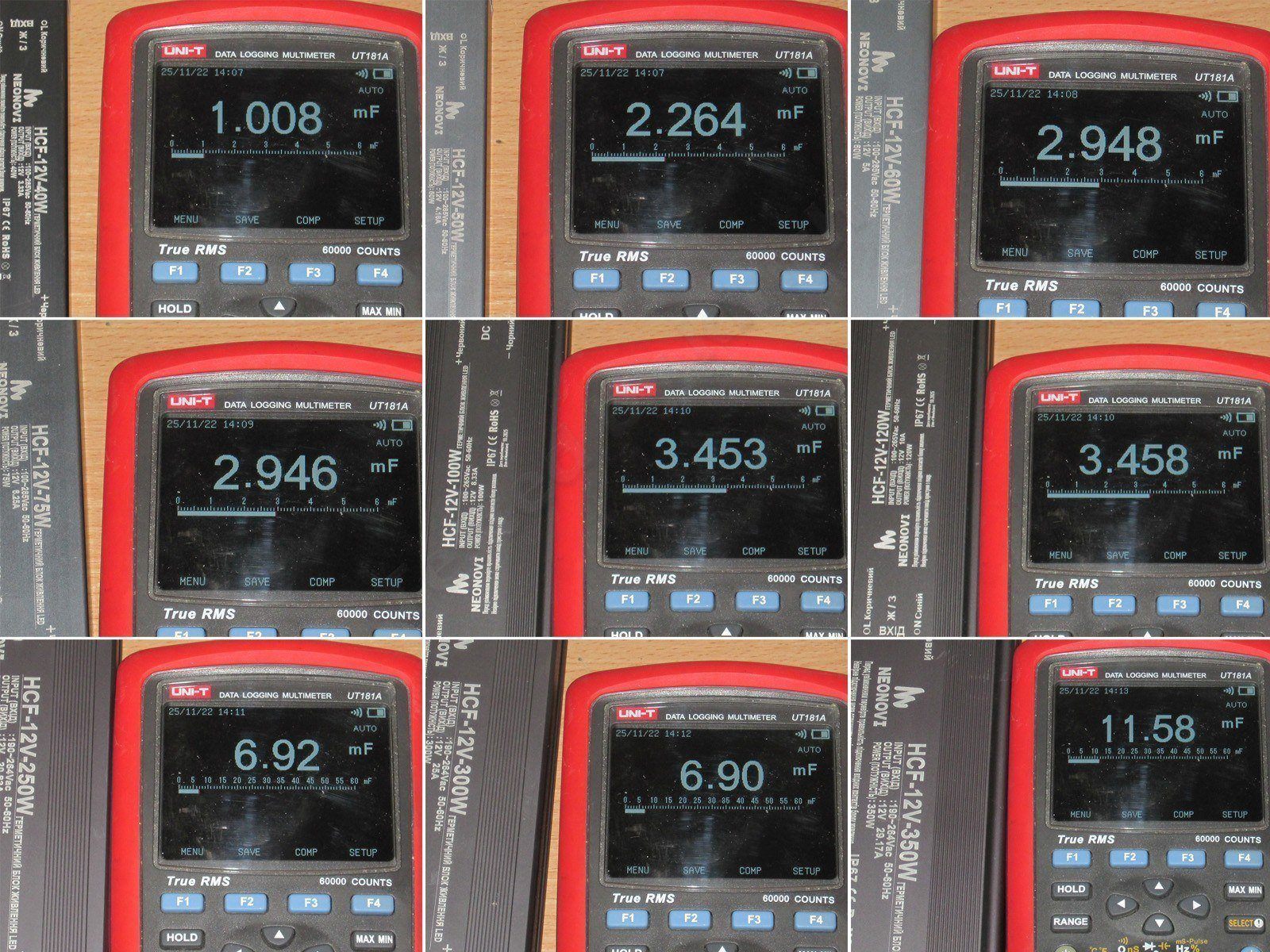 Еще одним методом сравнения, хоть и косвенного, является измерение емкости выходных конденсаторов. Ниже результаты для всех протестированных моделей - 40, 50, 60, 75, 100, 120, 250, 300 и 350 ватт.