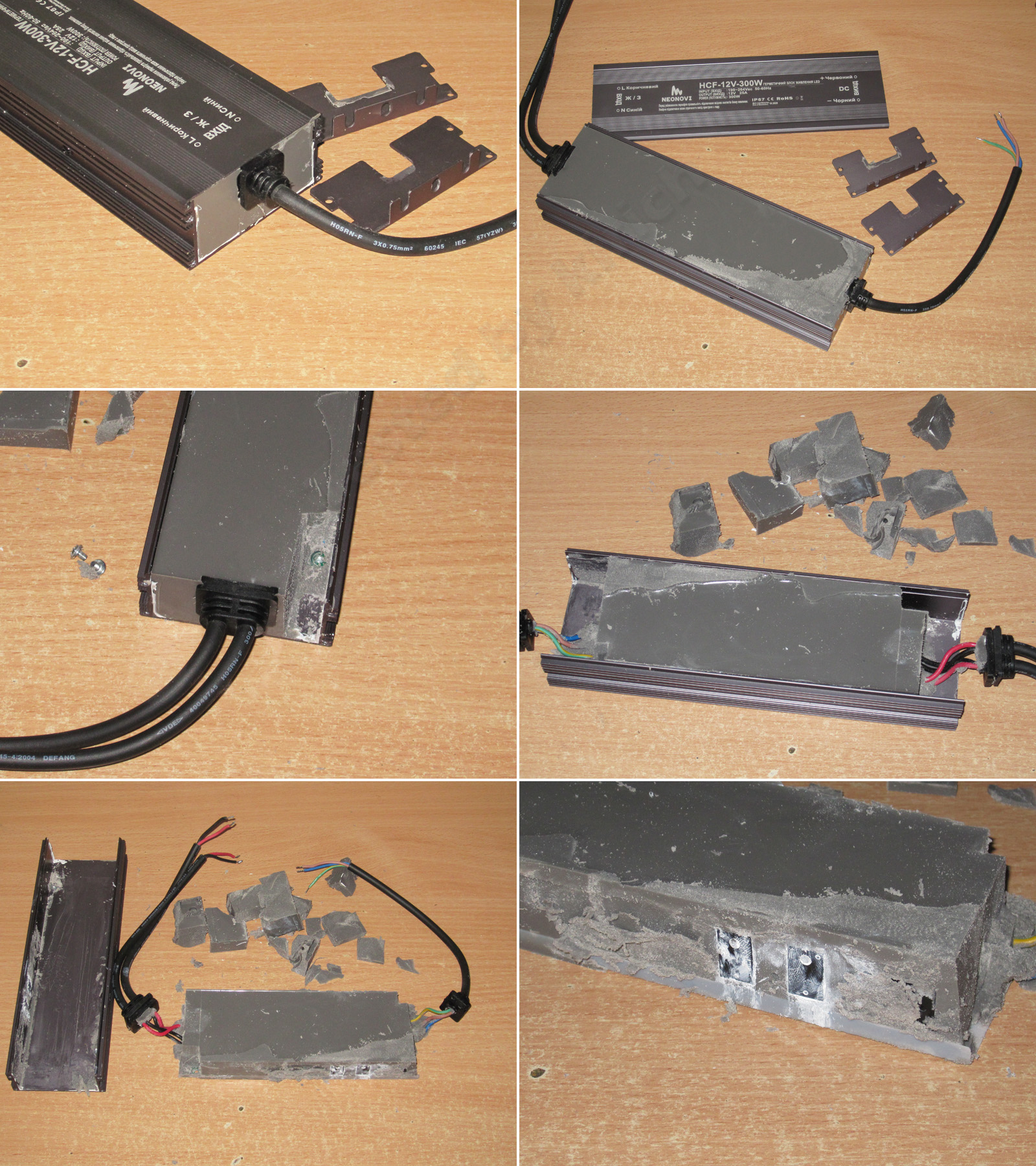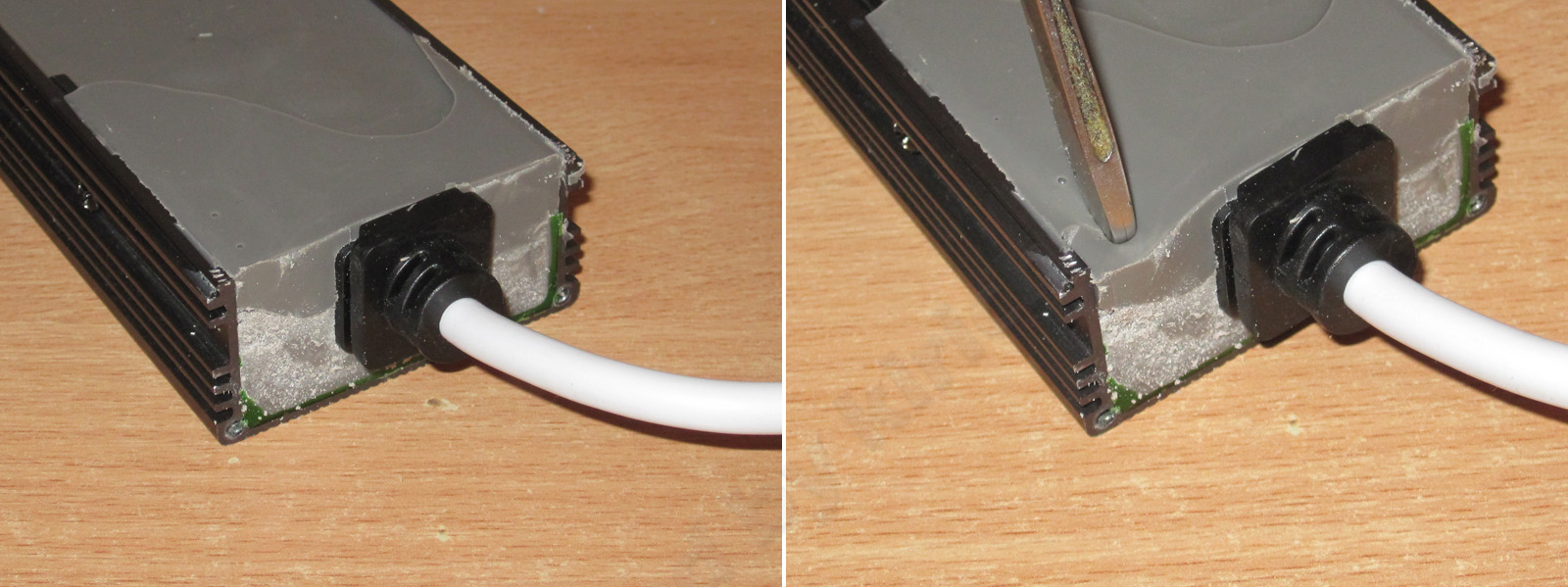 Внутри все очень хорошо залито компаундом, плотно, без щелей, а сам компаунд довольно мягкий, похожий скорее на резину средней плотности.
