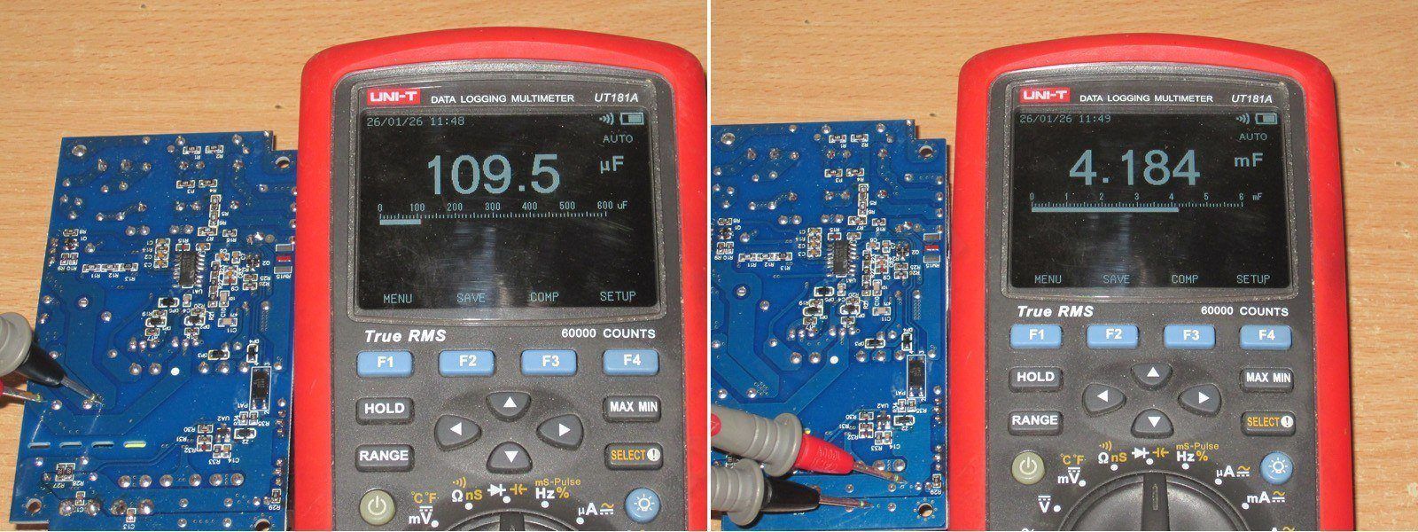 Емкость входного конденсатора около 110мкФ, не сильно меньше заявленной 120мкФ, по выходу реальные 4000мкФ.