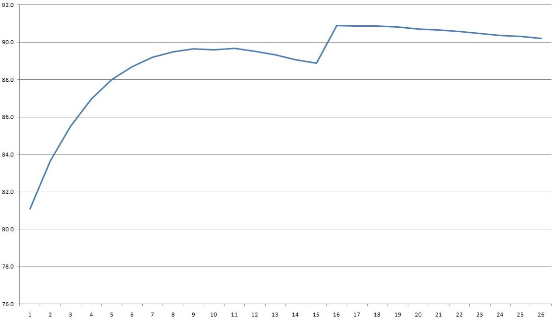 КПД измерялся в диапазоне токов 0.5-13А кратно 0.5А, при это имеет весьма любопытный вид, при токе 8 ампер имеем резкий подъем на несколько процентов. Я поначалу было грешил на ошибку в моих записях, такое бывает, но в этом случае можно сделать описку один раз, два, но не треть результатов. Судя по всему (я это не проверял), корректор запускается не сразу, а при определенной мощности, но в любом случае, весьма необычно.