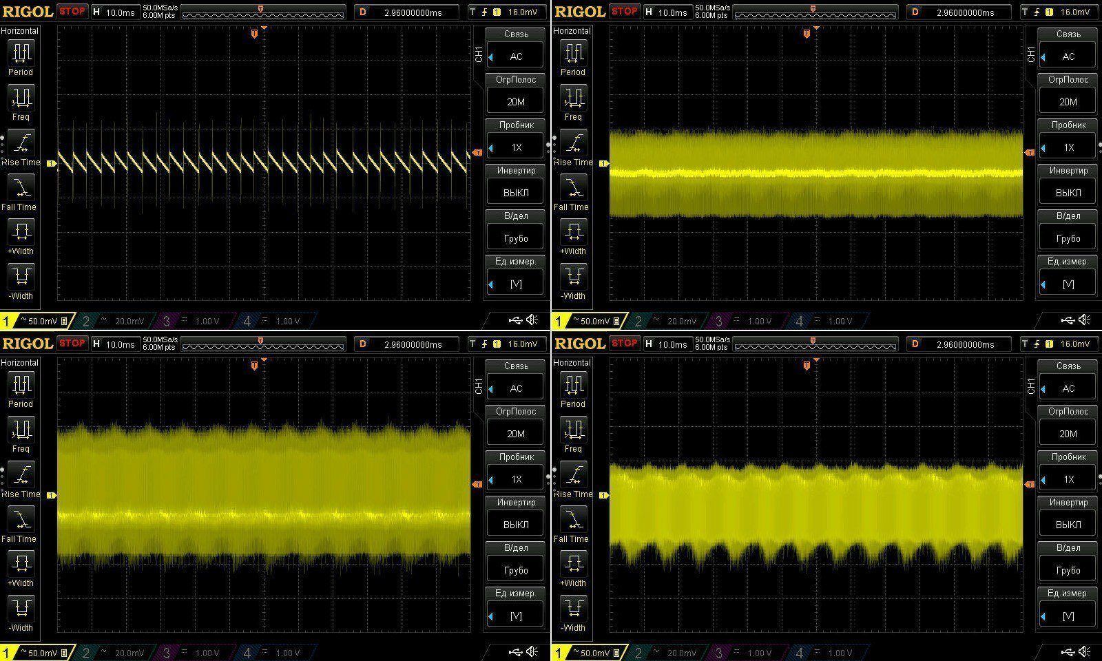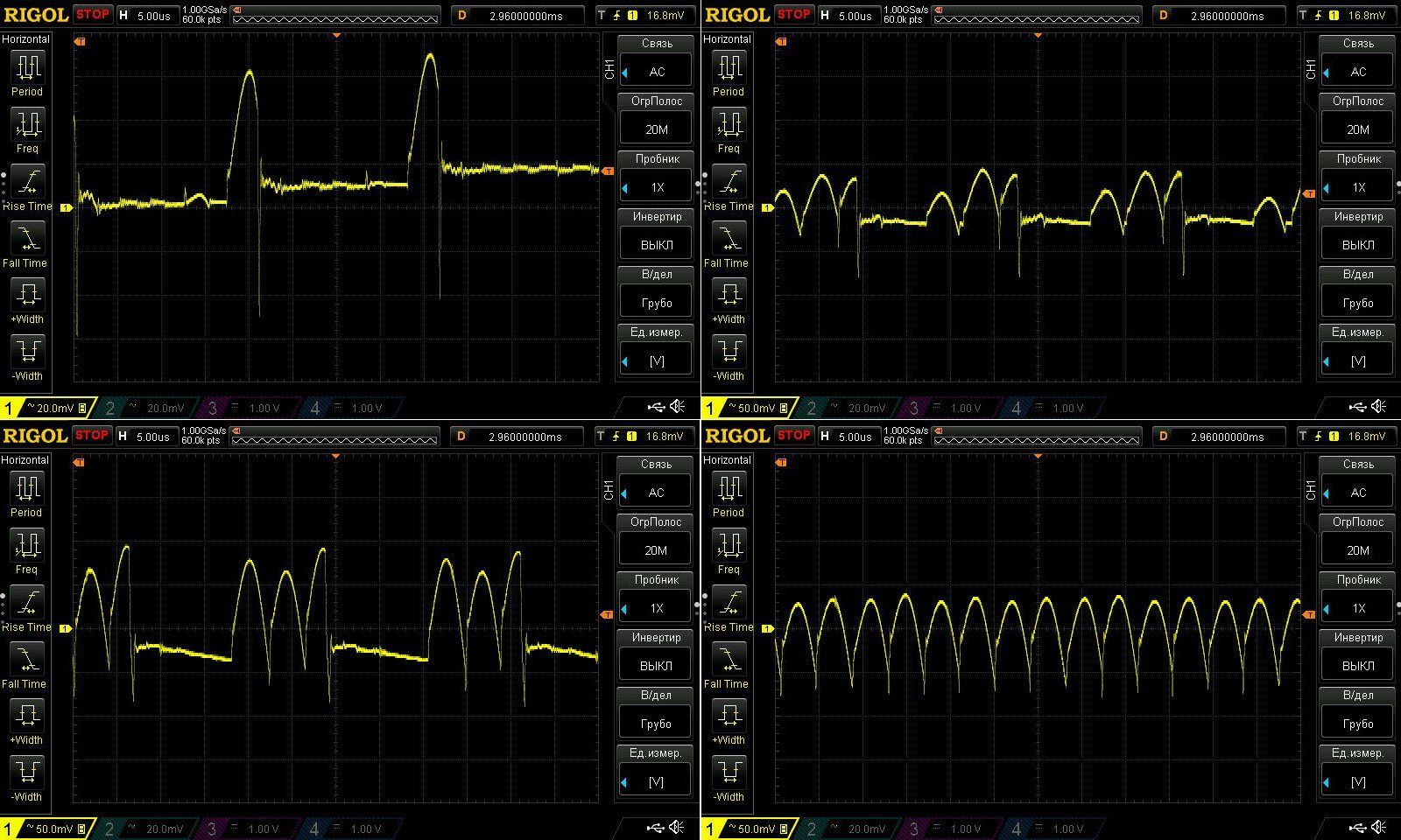 Без нагрузки обычно прямая линия, но периодически бывают всплески, на этой осциллограмме разрешение 20мВ, на всех последующих 50мВ.