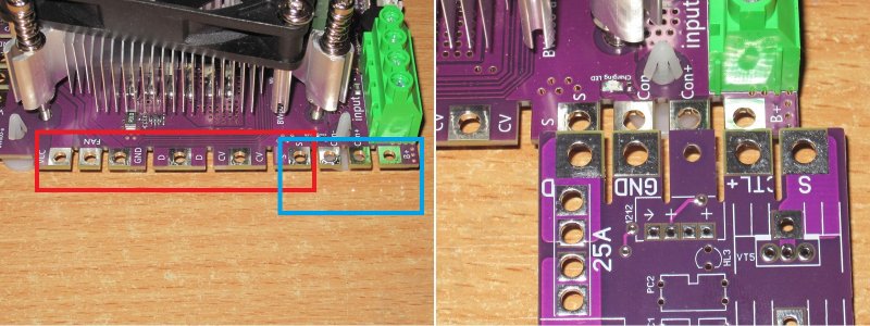 Так как платы покупались для переделки, то сходу выпаял клемник и как раз хотел показать, почему в тесте при токах 50А я сразу припаял провода к плате в обход этого клемника.