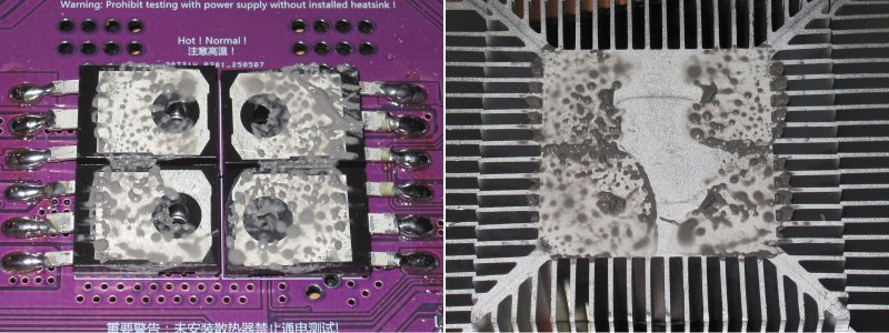 Снимаем транзисторы и предсказуемо видим термодатчик, размещенный в отверстии одного из транзисторов. И это правильное решение. Не, конечно правильнее прикрепить термодатчик прямо к транзистору, но это очень нетехнологично, потому в данном случае это разумный компромисс.