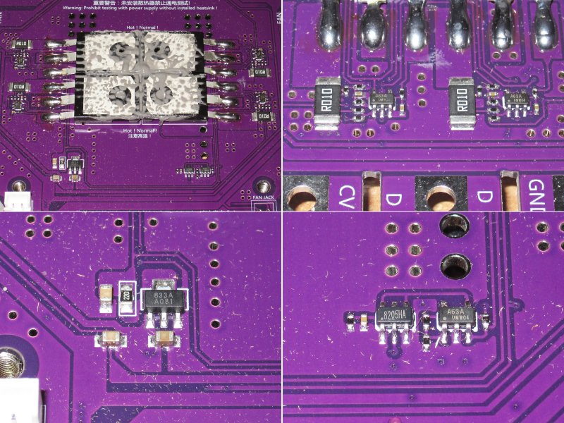 4. А вот тут меня приятно удивили, это узел защиты от перегрева, на ОУ собрана схема измерения температуры, а на полевом транзисторе узел, который в случае перегреве замыкает сигнал управления на землю, а так как этот сигнал общий для всей системы включая основную плату, то в случае перегрева нагрузка просто отключает (или снижает почти до нуля) ток. Термодатчик находится под тем же транзистором что и на основной плате, именно потому здесь также три отверстия под транзисторами вместо четырех.