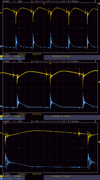 В этом тесте ток везде был одинаков, 6 ампер, но изменялось выходное напряжение, 3.3, 5.0, 12, 25, 40 и 55 вольт. Самый большой размах был при выходном 55 вольт, но влез в заявленные 100мВ даже с учетом «иголок».