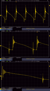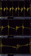 3, 4. Реакция на подключение/отключение нагрузки. На выходе было выставлено 12 Вольт, был постоянно подключен резистор 30 Ом и параллельно ему подключался (или отключался) резистор 3.3 Ома, соответственно здесь реакция на перепад тока 0.4-4А и 4-0.4А.
