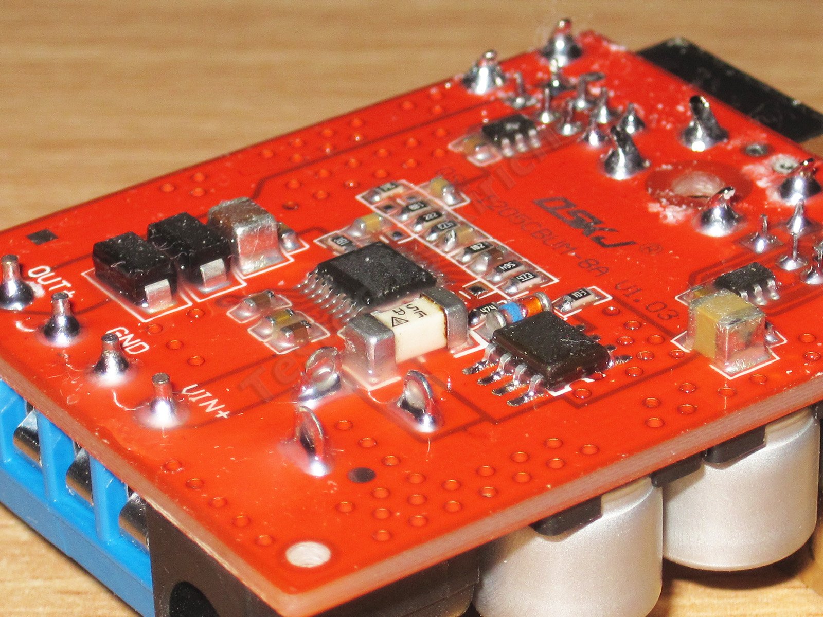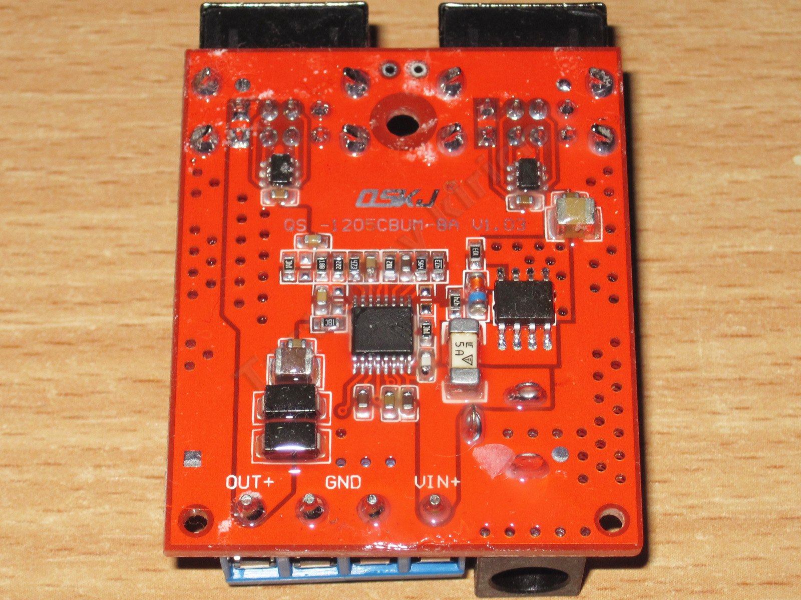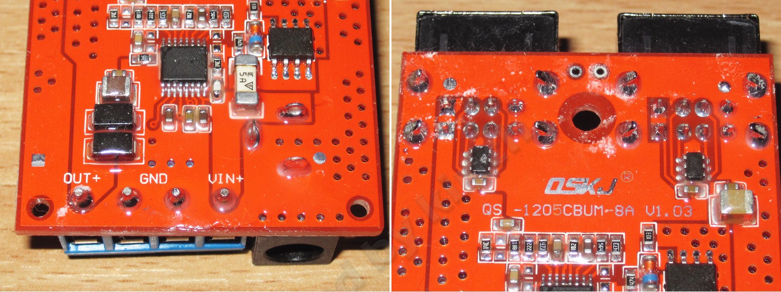 Также радует наличие керамических конденсаторов по линиям питания и два супрессора установленные параллельно выходу 5 Вольт, предназначенные для защиты нагрузки в случае пробоя силовых транзисторов. Конечно такая защита не дает 100% гарантии, но шанс выживаемости увеличивает.