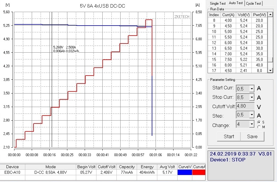 1. Хорошую стабилизацию напряжения, в диапазоне от нулевого тока до максимальной нагрузки напряжение падает всего на 60-70мВ. Нагрузка и измерение производилось на клеммнике, а не USB разъеме.