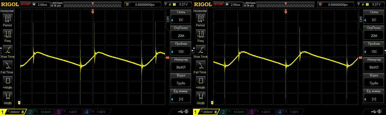 Есть пульсации в виде "иголок", которые легче гасить, но которые зависит от тока нагрузки и которые имеют заметно ольший размах.