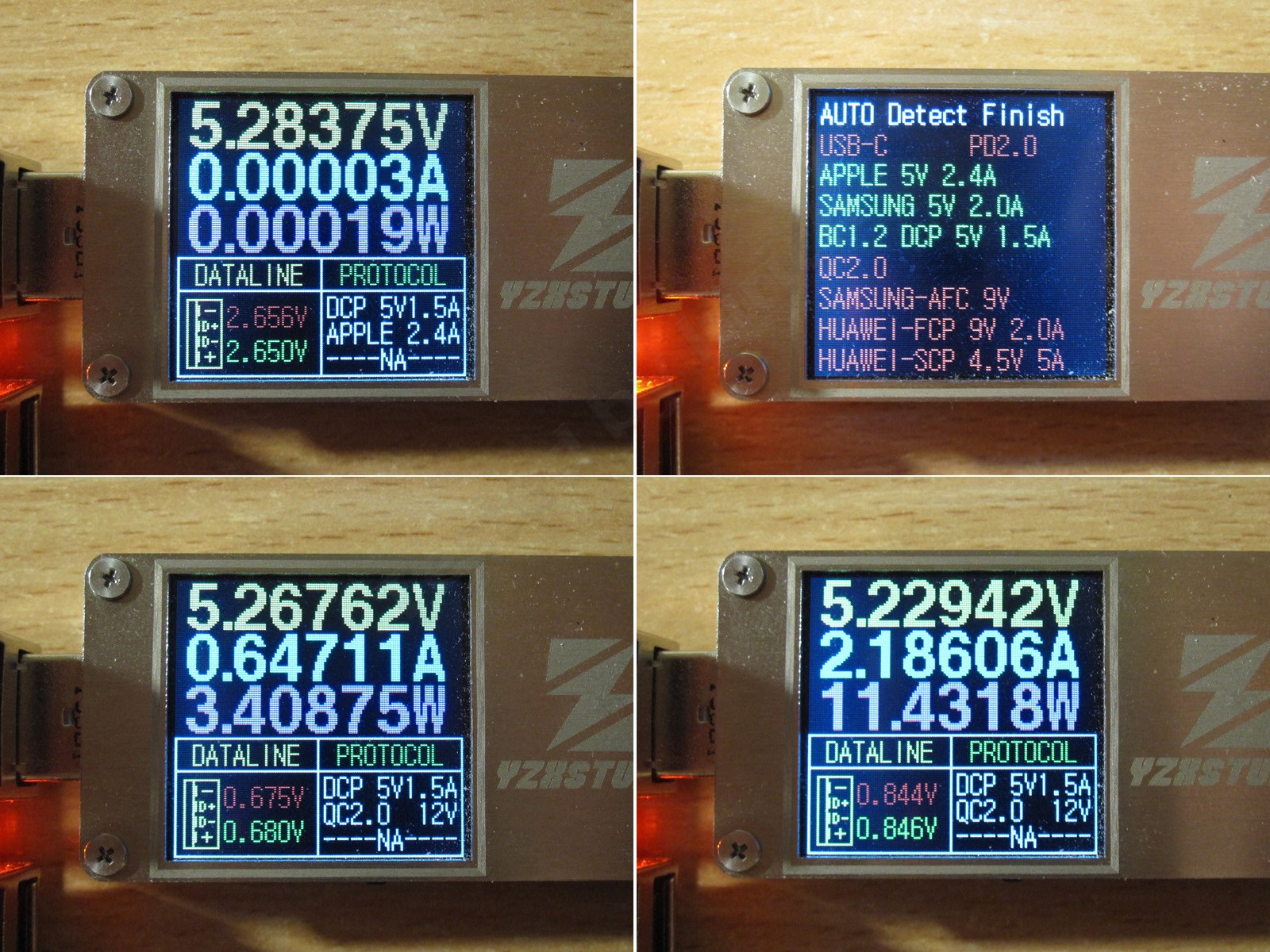 2. Поддерживается несколько режимов эмуляции. Но что любопытно, при первых тестах один выход стабильно отображал режим QC 5 Вольт, но когда я начал через время готовить обзор и повторил тесты, то больше такого не встречал...