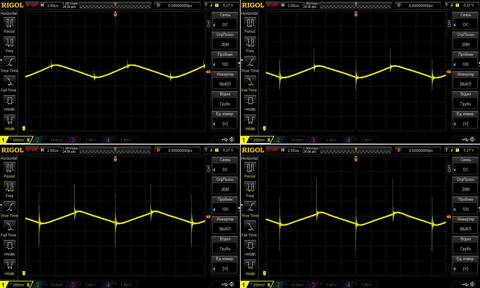 А вот пульсации я бы не назвал маленькими, основные, которые сложнее погасить, составляют 180мВ в любом режиме. На осциллограммах нагрузка 0-33-66-100%