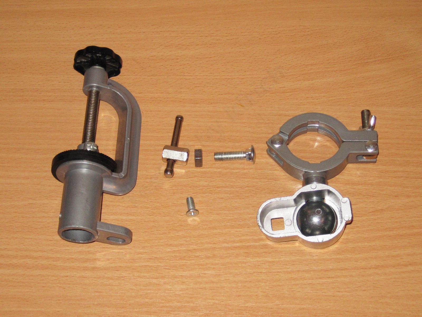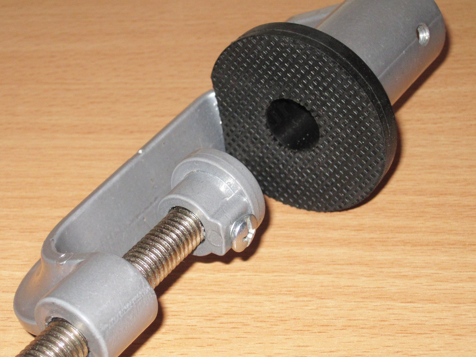 Винтовая часть прижимного механизма не шарнирная, потому при фиксации держателя к крышке стола она вращается вместе с винтом.